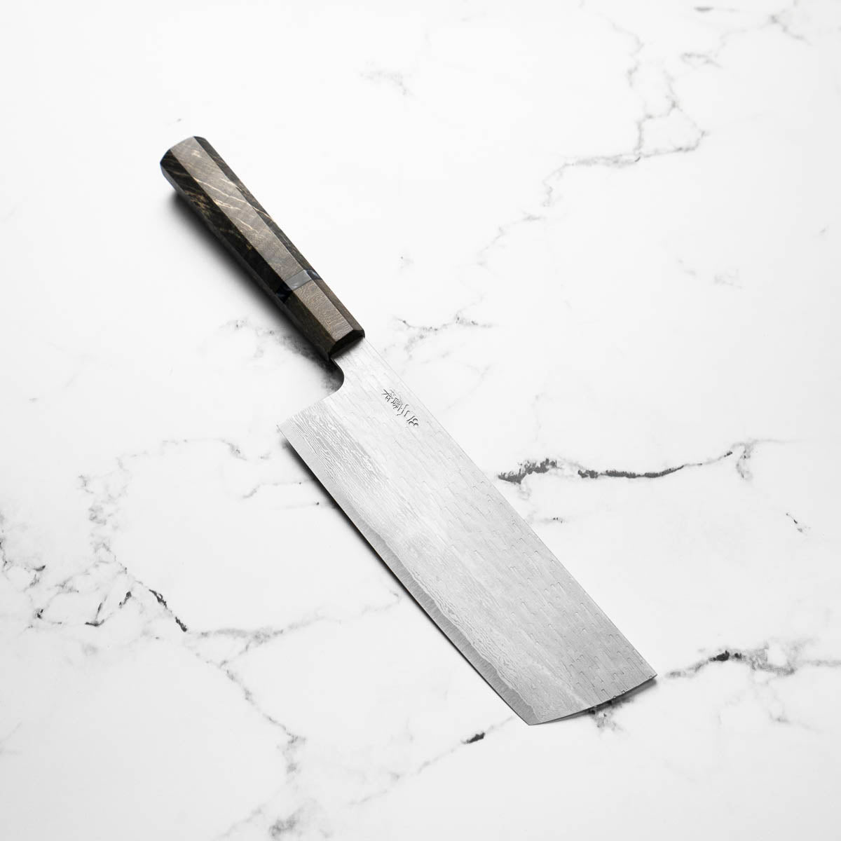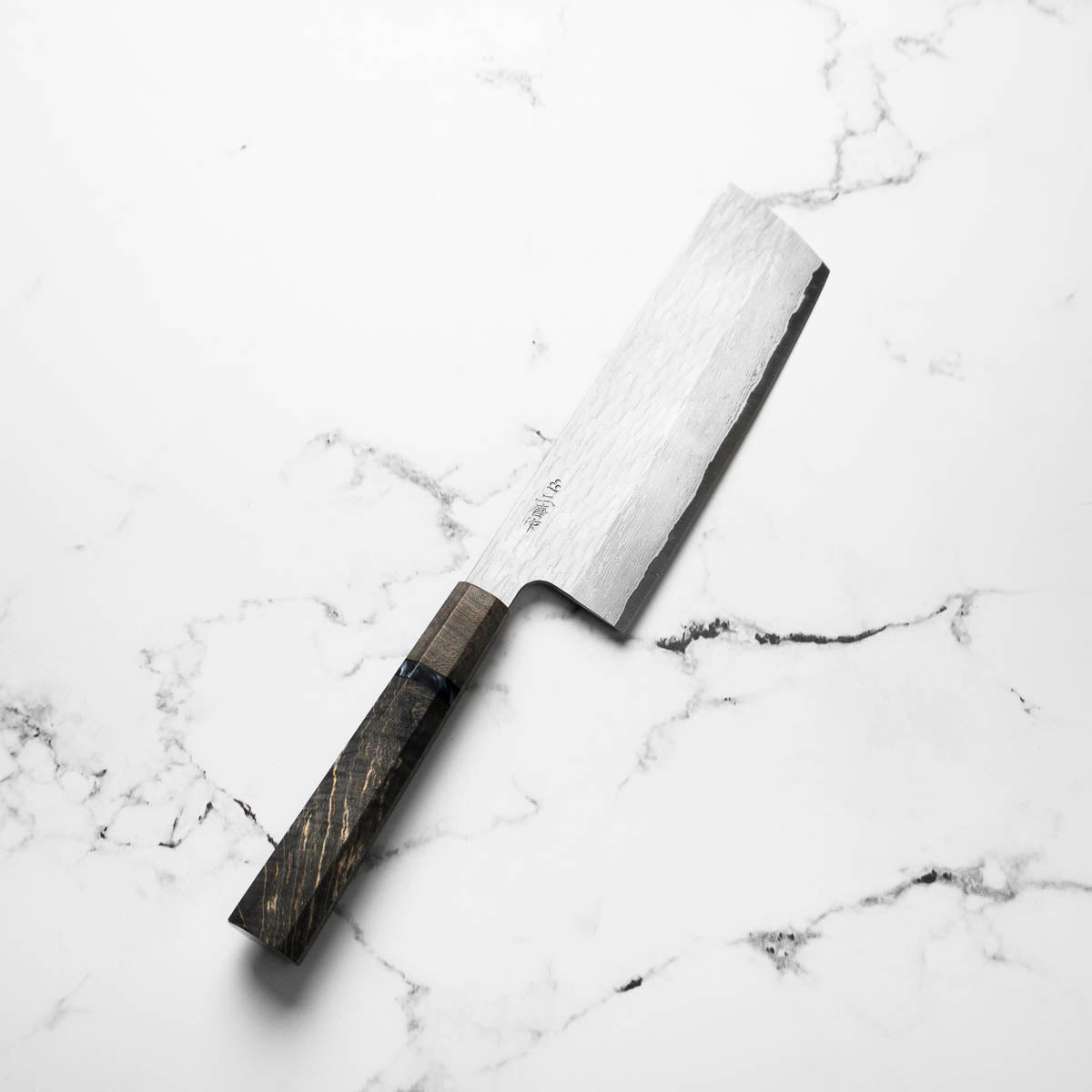 Probably the most commonly used carbon steel in Japanese chef knives, Aogami or “Blue” paper steel gets its name from the blue paper that Hitachi Metals supplies the steel in.