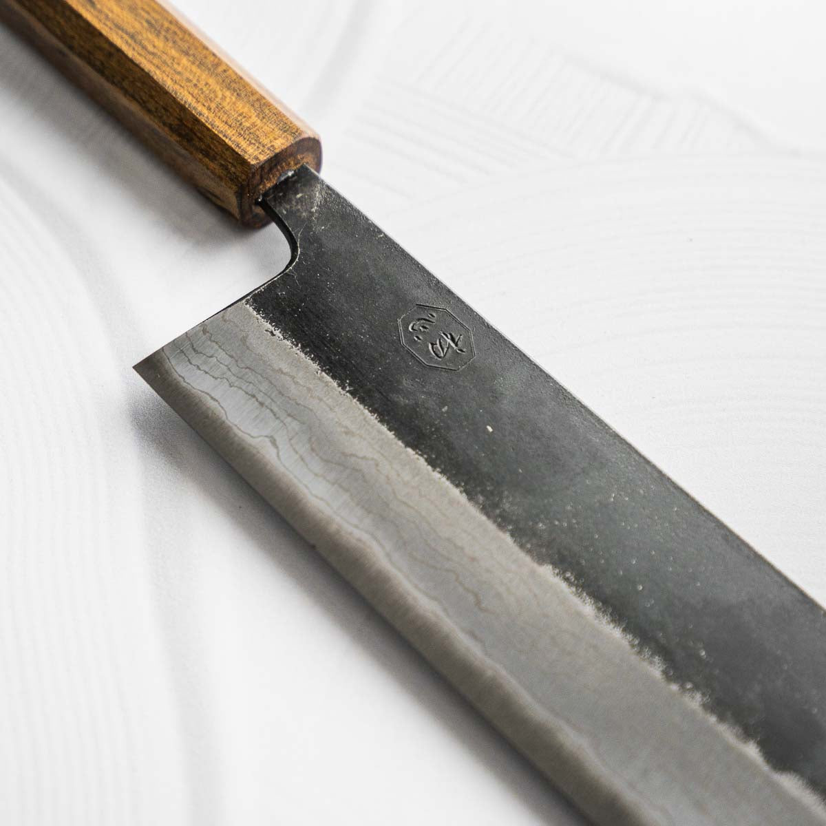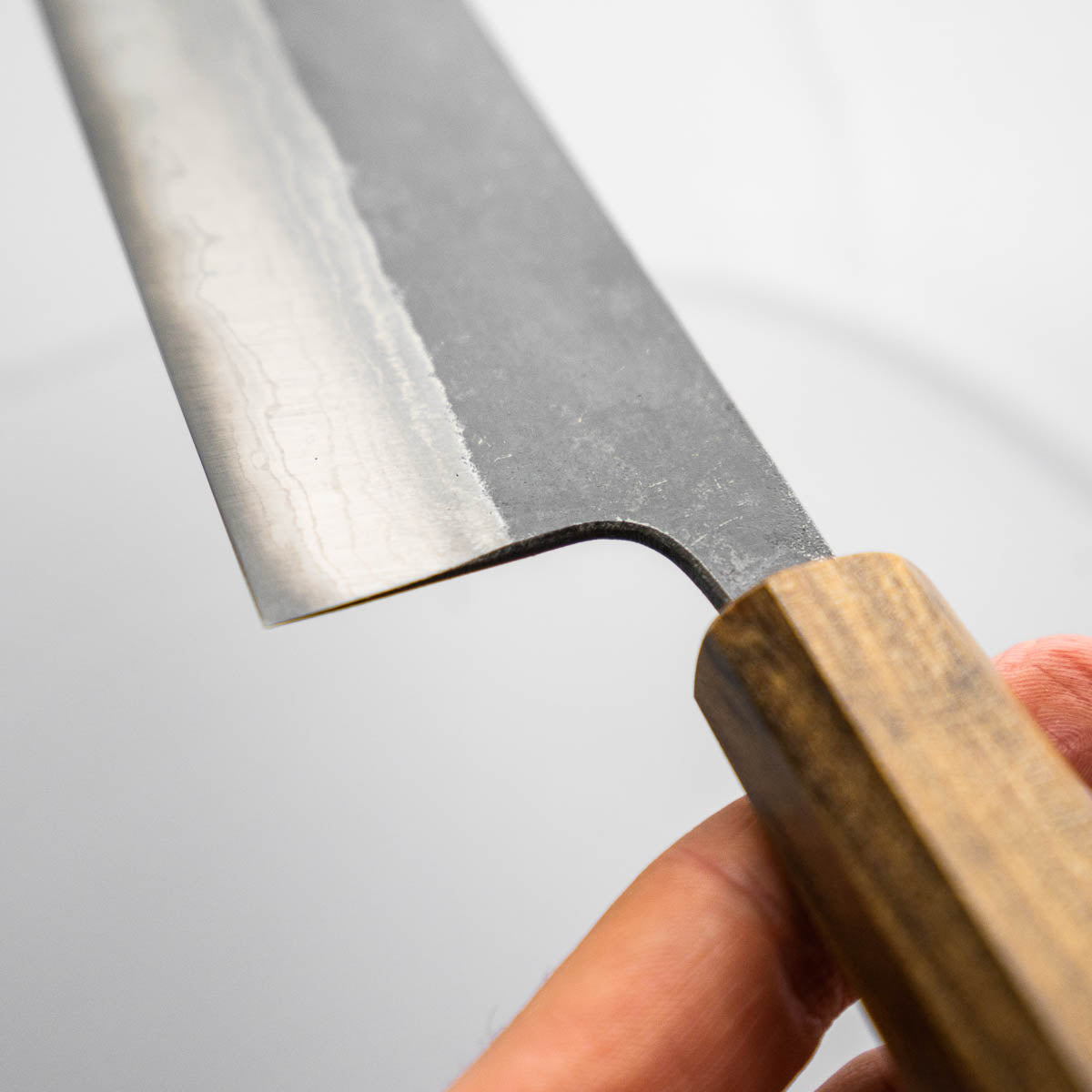 This knife is made from a high-carbon steel and as such, will require a little more care than a regular off-the-shelf knife. It must be dried shortly after use, as prolonged exposure to moisture can cause rust spots to appear. A very light coat of oil during storage also helps to prevent rust spots. A patina (colouration and seasoning of the steel) will occur with use.