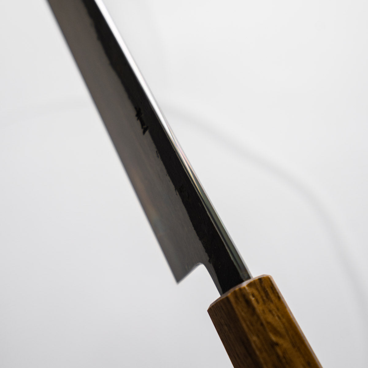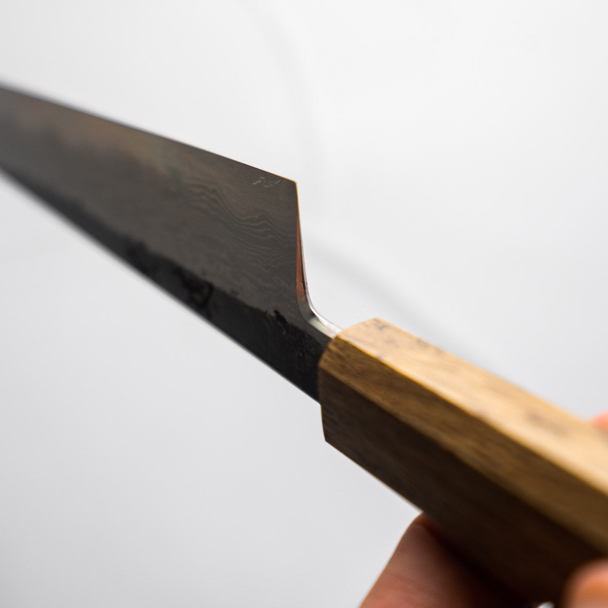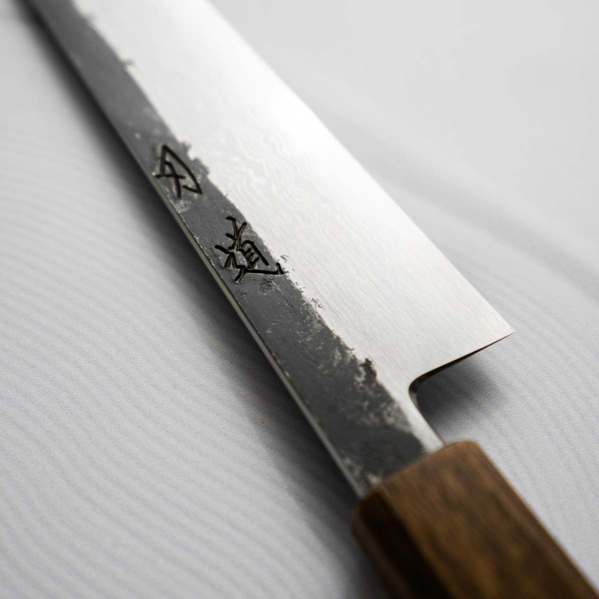 This knife is made from a high-carbon steel and as such, will require a little more care than a regular off-the-shelf knife. It must be dried shortly after use, as prolonged exposure to moisture can cause rust spots to appear. A very light coat of oil during storage also helps to prevent rust spots. A patina (colouration and seasoning of the steel) will occur with use.