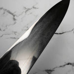 This knife is made from a high-carbon steel and as such, will require a little more care than a regular off-the-shelf knife. It must be dried shortly after use, as prolonged exposure to moisture can cause rust spots to appear. A very light coat of oil during storage also helps to prevent rust spots. A patina (colouration and seasoning of the steel) will occur with use.