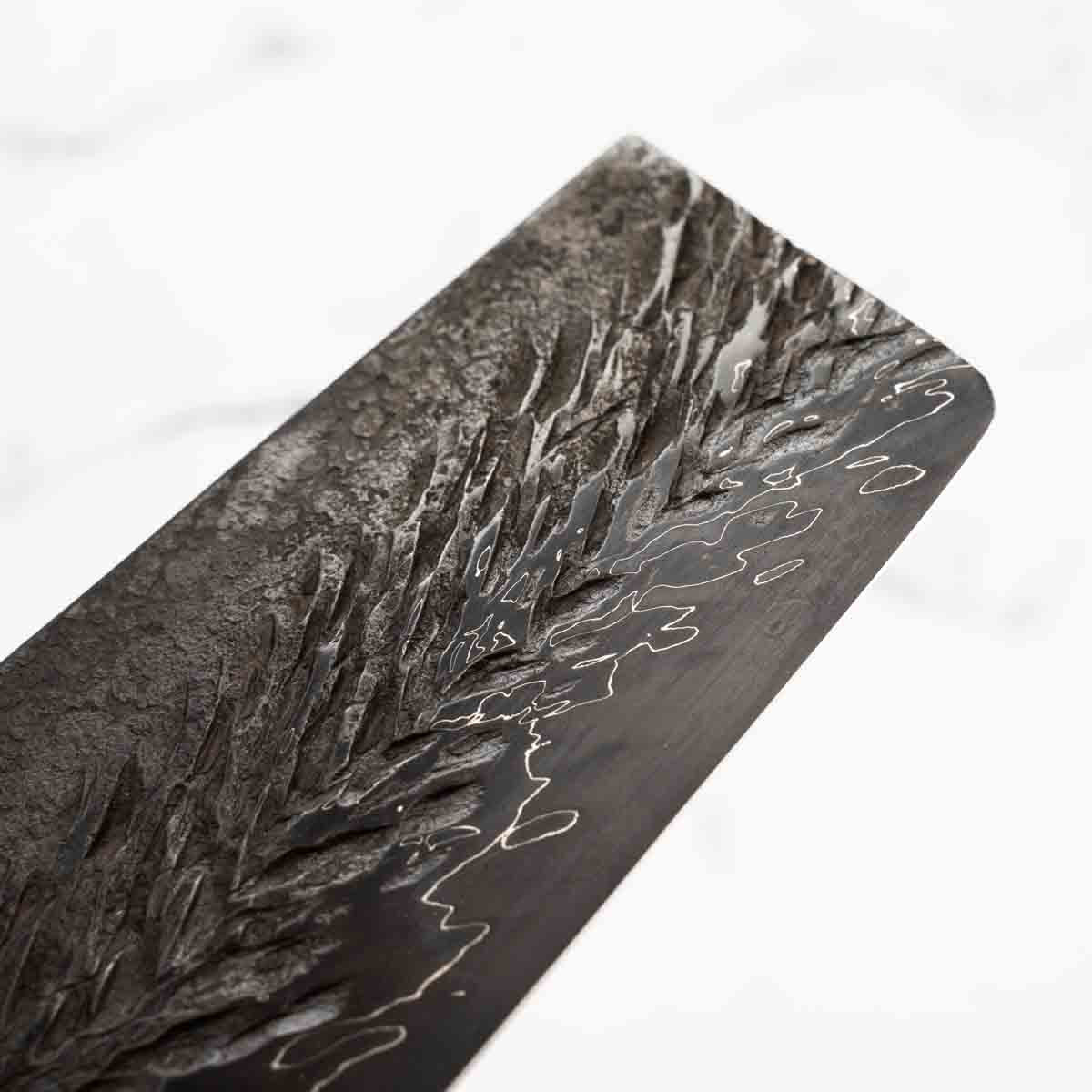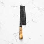 This knife is made from a high-carbon steel and as such, will require a little more care than a regular off-the-shelf knife. It must be dried shortly after use, as prolonged exposure to moisture can cause rust spots to appear. A very light coat of oil during storage also helps to prevent rust spots. A patina (colouration and seasoning of the steel) will occur with use.