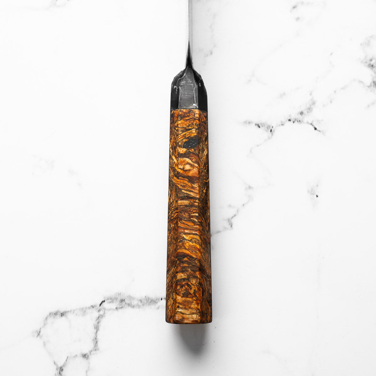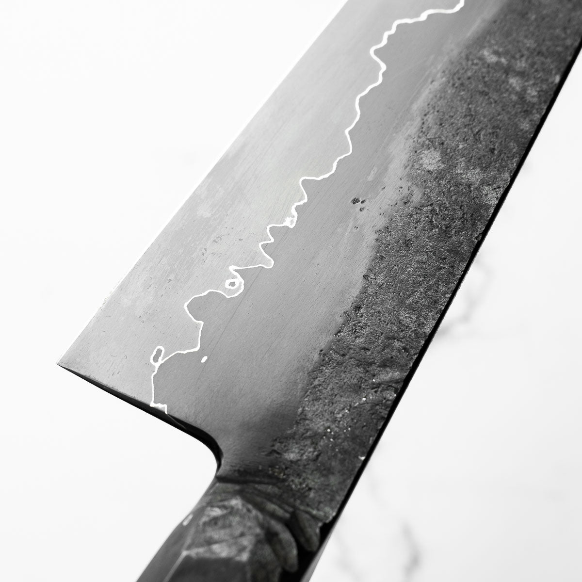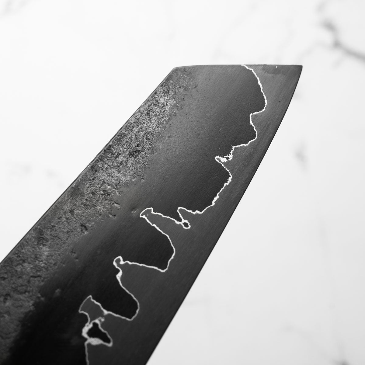 This knife is made from a high-carbon steel and as such, will require a little more care than a regular off-the-shelf knife. It must be dried shortly after use, as prolonged exposure to moisture can cause rust spots to appear. A very light coat of oil during storage also helps to prevent rust spots. A patina (colouration and seasoning of the steel) will occur with use.