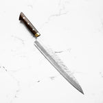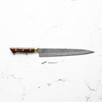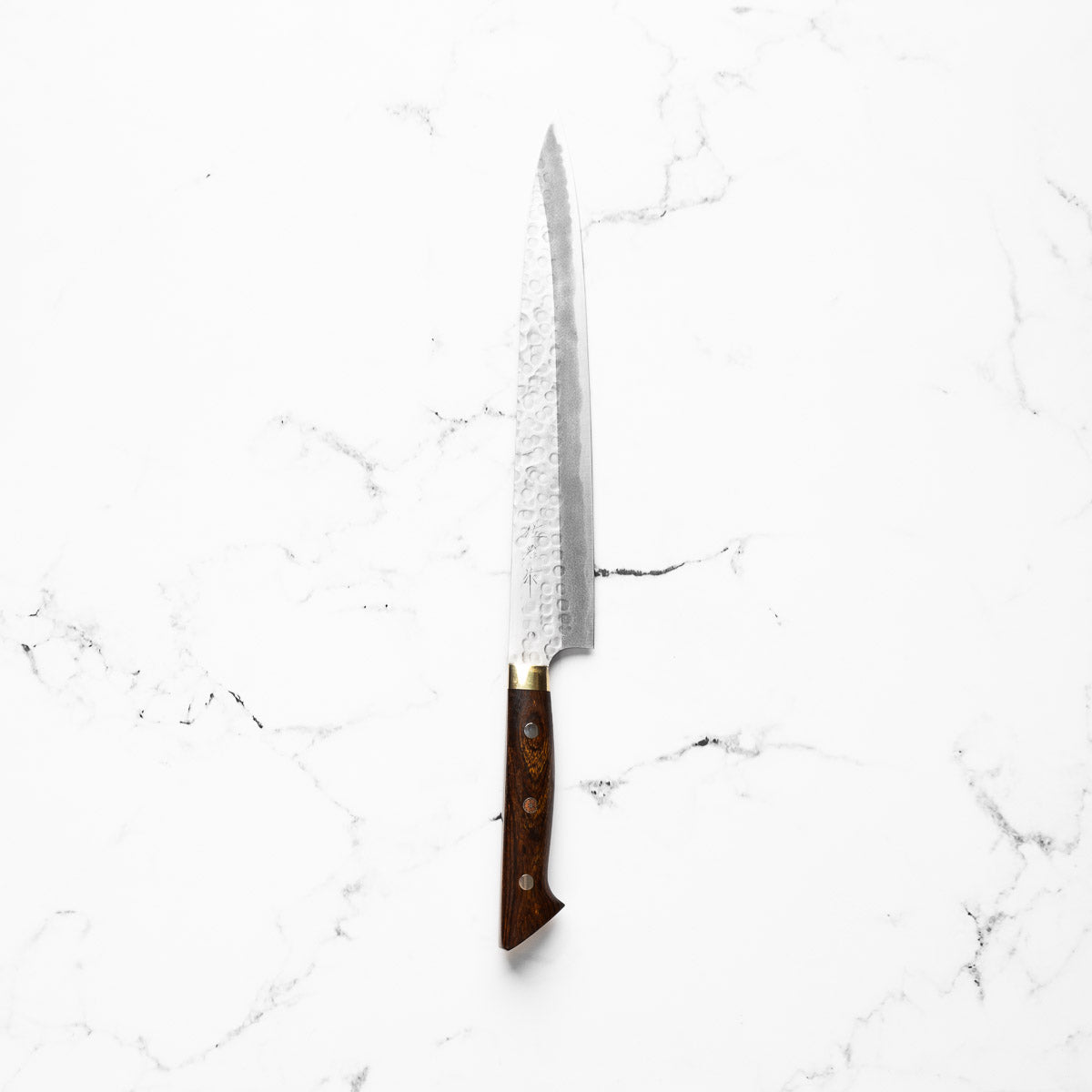 The Sujihiki knife, a traditional Japanese slicer, is designed for carving and fileting. With its long, narrow blade, typically ranging from 240mm to 330mm, it excels in creating clean, smooth cuts through meat and fish. Its length ensures long, uninterrupted strokes, making it perfect for precise slicing tasks.