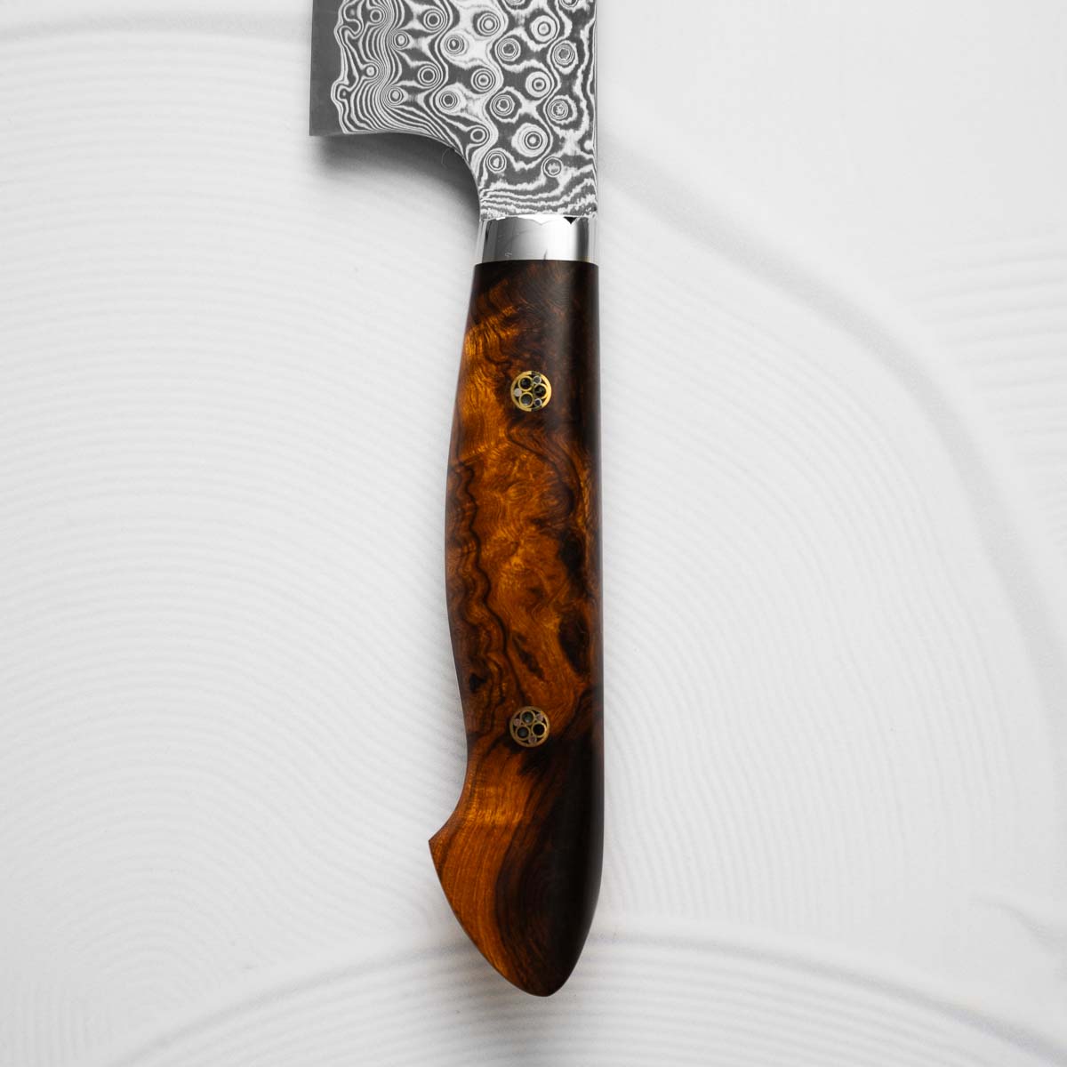 Nigara Hamono are truly some of the most experienced knifemakers in Japan. Now on their 8th generation of blacksmiths, they are masters at stainless damascus forging and heat treatment. The Anmon Damascus we have available have a matte finish and are polished underneath, resulting in a brilliant visual contrast.