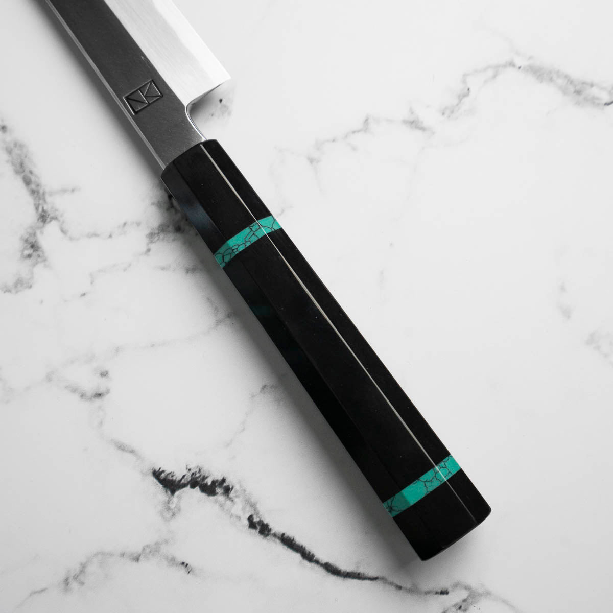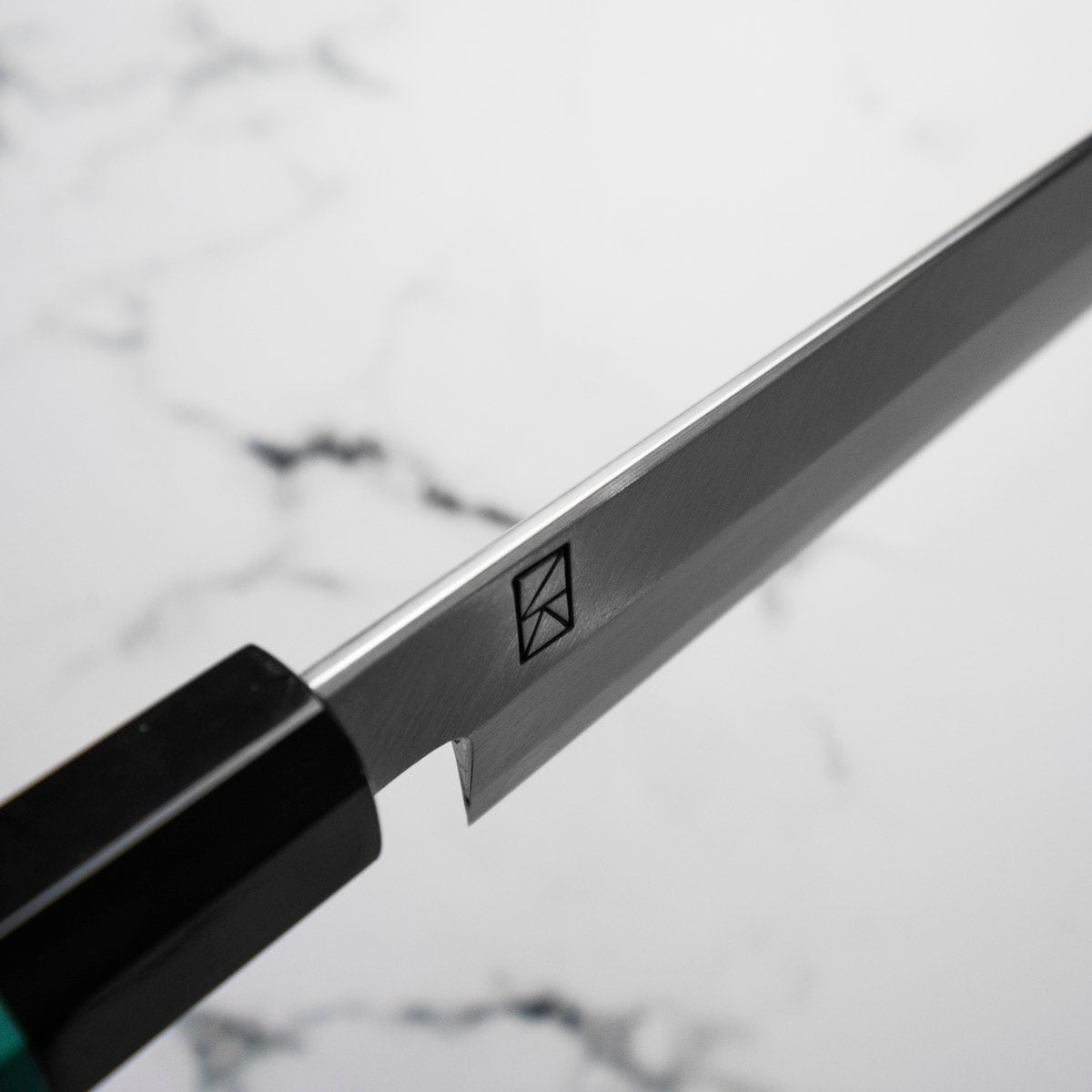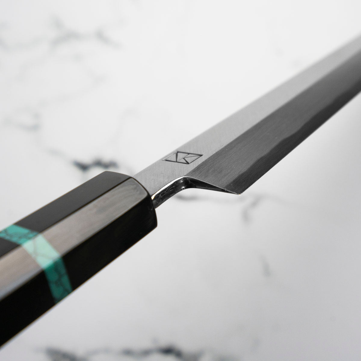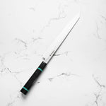 The Yanagiba knife, a staple in traditional Japanese cuisine, is a slender, long-bladed knife primarily used for slicing sashimi and sushi. Its graceful, single-beveled edge guarantees precise, thin cuts, preserving the texture and integrity of the fish. Revered for its sharpness and balance, the Yanagiba is essential for authentic Japanese food preparation.