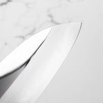 The Santoku knife, a classic in Japanese kitchens, translates to "three virtues," symbolizing its proficiency in slicing, dicing, and mincing. With a shorter, versatile blade and a balanced design, it's ideal for a range of tasks, from cutting meat to chopping vegetables, making it a beloved all-purpose tool.