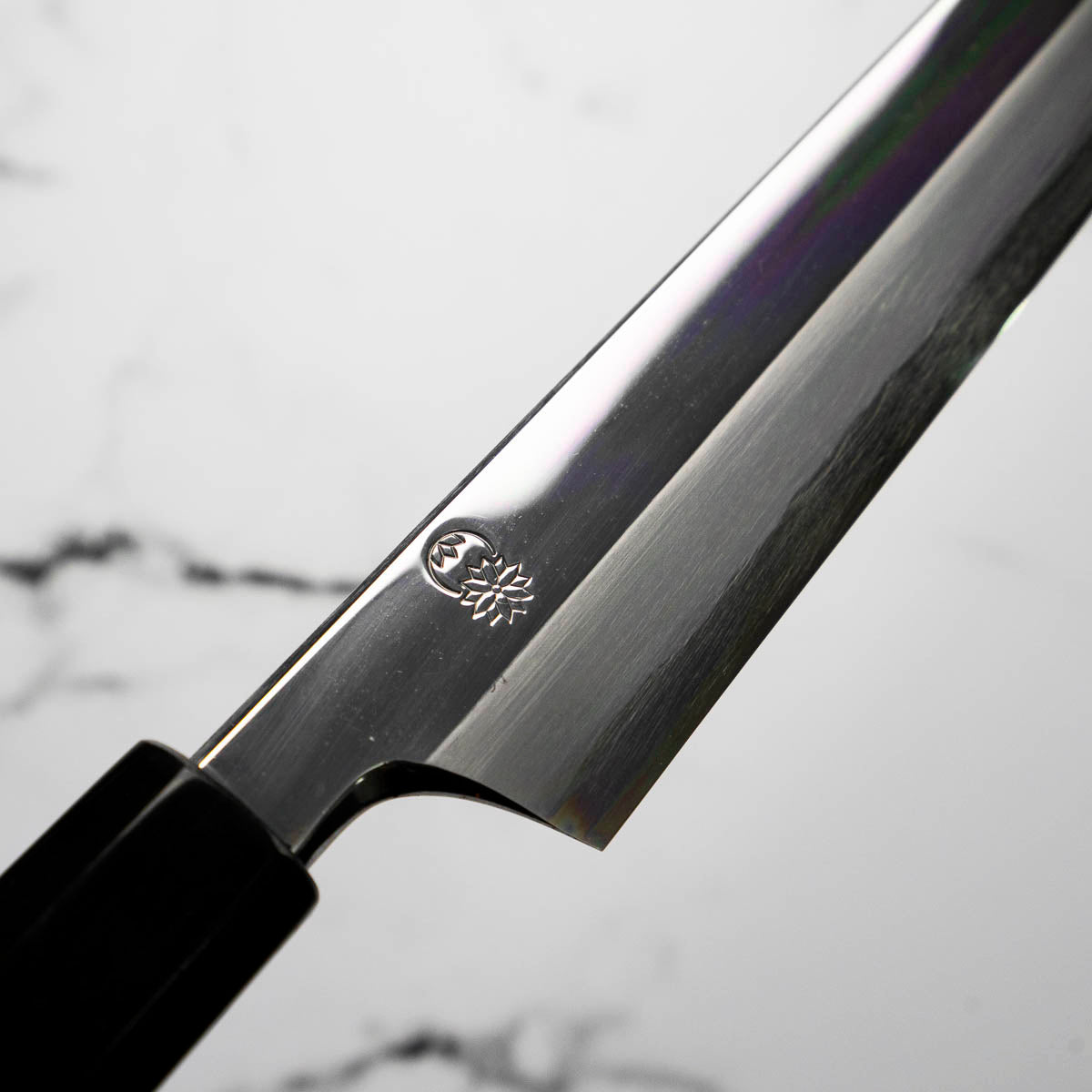 The Yanagiba knife, a staple in traditional Japanese cuisine, is a slender, long-bladed knife primarily used for slicing sashimi and sushi. Its graceful, single-beveled edge guarantees precise, thin cuts, preserving the texture and integrity of the fish. Revered for its sharpness and balance, the Yanagiba is essential for authentic Japanese food preparation.