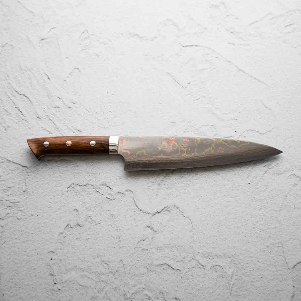 He works across a wide spectrum of steels, from classic Japanese carbon steels to advanced stainless alloys like R2 and VG10. His signature Damascus finishes — including Rainbow, Diamond, and Black Nickel — are unmistakable, and are often paired with an eclectic range of handle styles that reflect both innovation and deep respect for materials.