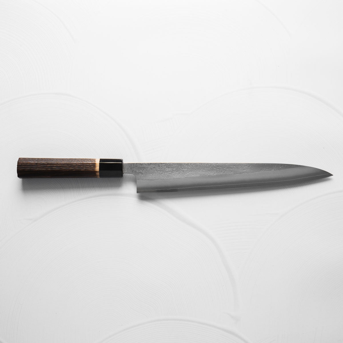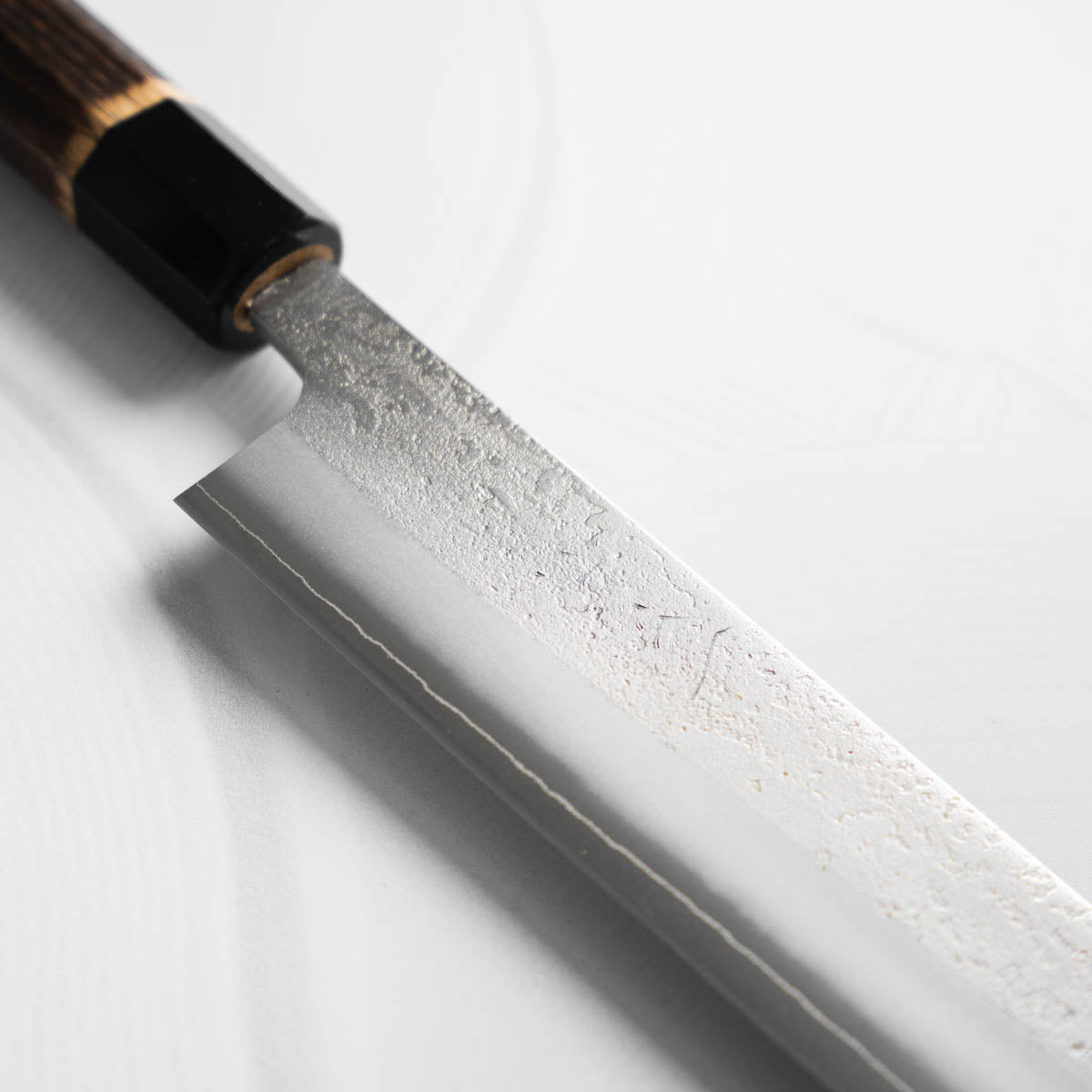 One of their most celebrated offerings is the SKD steel series — featuring a semi-stainless high-carbon core clad in stainless steel. The blades showcase a distinctive wide-bevel grind with a shallow hammer texture that sits stylistically between nashiji and kurouchi finishes. Paired with traditional burnt chestnut handles, each knife reflects Yoshikane’s dedication to consistency, craftsmanship, and timeless design.