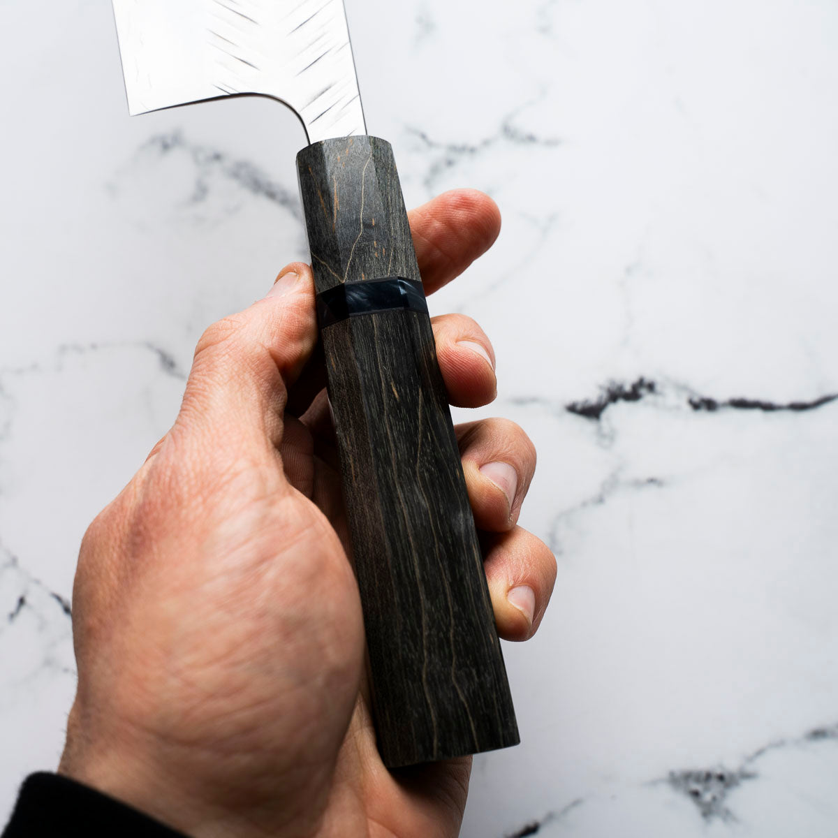 Under his personal brand Kintaro, he hand-forges blades featuring some of the most striking Damascus patterns we’ve seen, with crisp lines and elegant finishes. His knives are lightweight, thin behind the edge, and a pleasure to sharpen and maintain — a combination that makes them equally suited to professional kitchens and passionate home cooks.