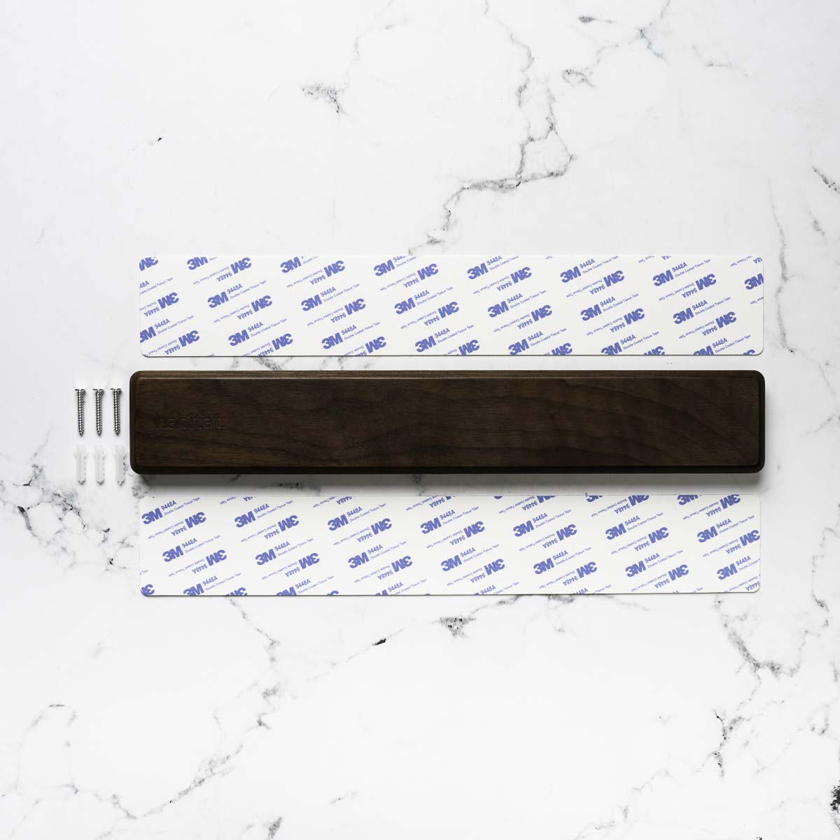 I recently picked up a habitat magnetic knife holder and installed it on my glass splash back in the kitchen. I used the 3M strips that came in the box. One was enough to hold it without a problem. The holder easily and securely holds my 6 knives with it’s strong magnet, making my knives easily available without the tedious task of rummaging through the kitchen drawers. The walnut finish look great and compliments my knives well
