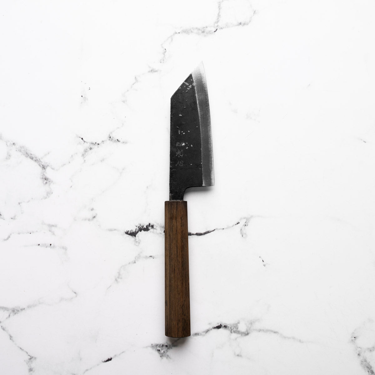 This knife is made from a high-carbon steel and as such, will require a little more care than a regular off-the-shelf knife. It must be dried shortly after use, as prolonged exposure to moisture can cause rust spots to appear. A very light coat of oil during storage also helps to prevent rust spots. A patina (colouration and seasoning of the steel) will occur with use.