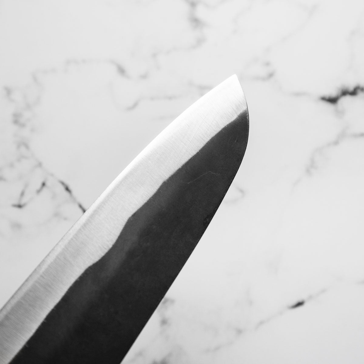 This knife is made from a high-carbon steel and as such, will require a little more care than a regular off-the-shelf knife. It must be dried shortly after use, as prolonged exposure to moisture can cause rust spots to appear. A very light coat of oil during storage also helps to prevent rust spots. A patina (colouration and seasoning of the steel) will occur with use.