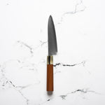The Petty knife, a quintessential tool in Japanese cuisine, is a smaller utility knife used for precise, delicate tasks. Often considered a smaller sibling to the chef's knife, it excels in hand-held tasks like peeling, trimming, and intricate cutting. Its versatility makes it an essential for detailed culinary work.