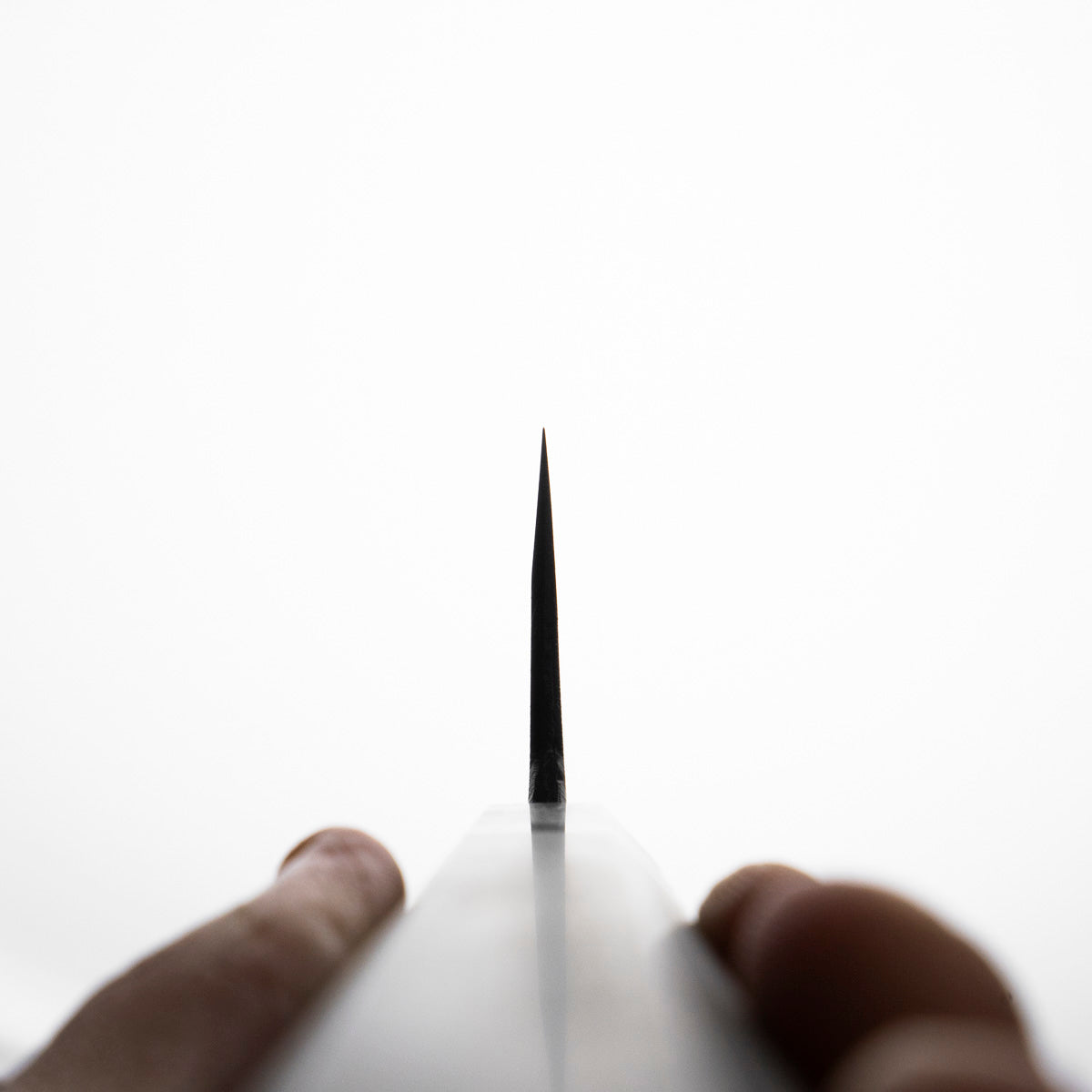 Japanese White Steel #2, a traditional high-carbon steel, is cherished for its purity and fine grain structure, enabling razor-sharp edges, at the cost of being reactive. It is one of the easiest steels to sharpen, but cannot be left wet for even short periods otherwise rust spots can occur. If you’re fastidious in your knife maintenance, this knife steel can be extremely rewarding to use.