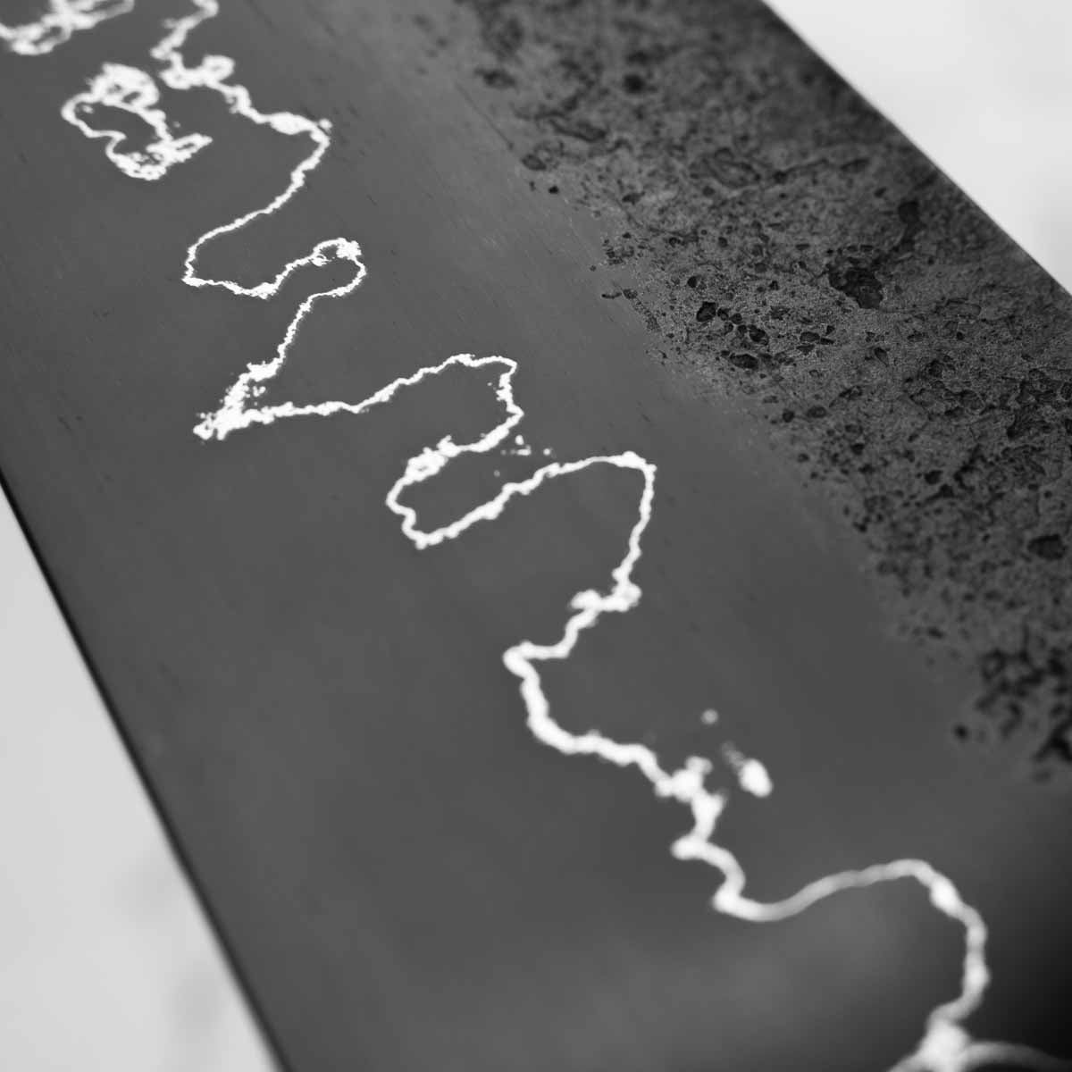 This knife is made from a high-carbon steel and as such, will require a little more care than a regular off-the-shelf knife. It must be dried shortly after use, as prolonged exposure to moisture can cause rust spots to appear. A very light coat of oil during storage also helps to prevent rust spots. A patina (colouration and seasoning of the steel) will occur with use.