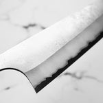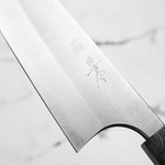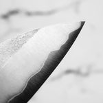 Japanese White Steel #2, a traditional high-carbon steel, is cherished for its purity and fine grain structure, enabling razor-sharp edges, at the cost of being reactive. It is one of the easiest steels to sharpen, but cannot be left wet for even short periods otherwise rust spots can occur. If you’re fastidious in your knife maintenance, this knife steel can be extremely rewarding to use.