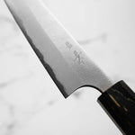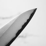 Japanese White Steel #2, a traditional high-carbon steel, is cherished for its purity and fine grain structure, enabling razor-sharp edges, at the cost of being reactive. It is one of the easiest steels to sharpen, but cannot be left wet for even short periods otherwise rust spots can occur. If you’re fastidious in your knife maintenance, this knife steel can be extremely rewarding to use.