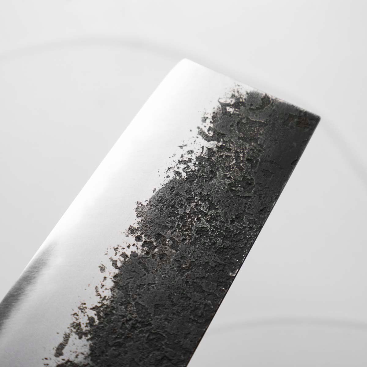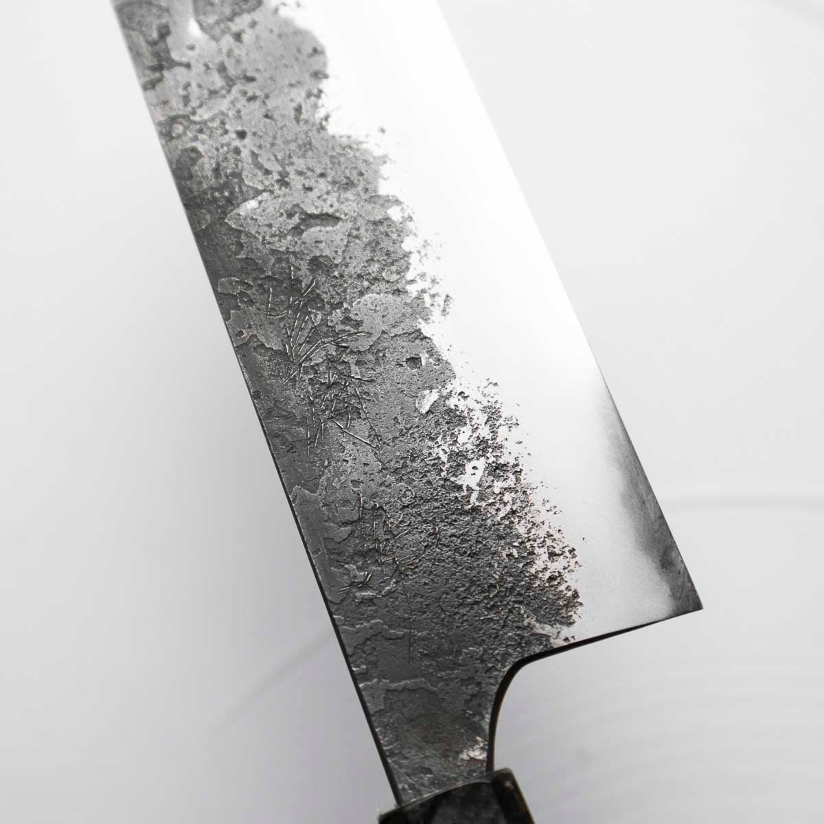 Japanese White Steel #2, a traditional high-carbon steel, is cherished for its purity and fine grain structure, enabling razor-sharp edges, at the cost of being reactive. It is one of the easiest steels to sharpen, but cannot be left wet for even short periods otherwise rust spots can occur. If you’re fastidious in your knife maintenance, this knife steel can be extremely rewarding to use.