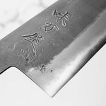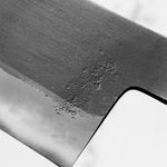 Japanese White Steel #2, a traditional high-carbon steel, is cherished for its purity and fine grain structure, enabling razor-sharp edges, at the cost of being reactive. It is one of the easiest steels to sharpen, but cannot be left wet for even short periods otherwise rust spots can occur. If you’re fastidious in your knife maintenance, this knife steel can be extremely rewarding to use.
