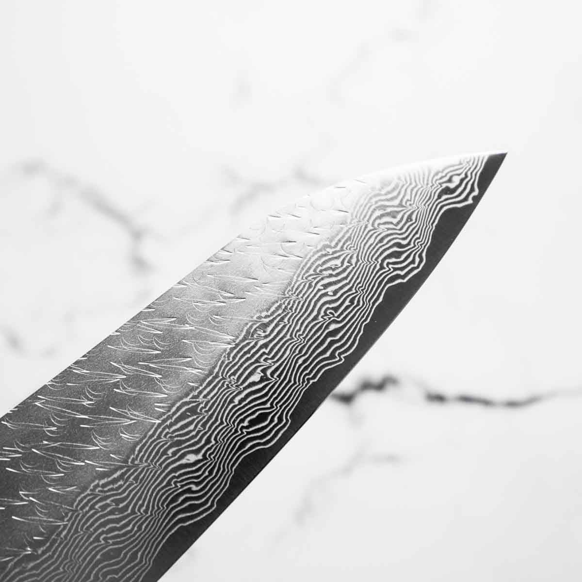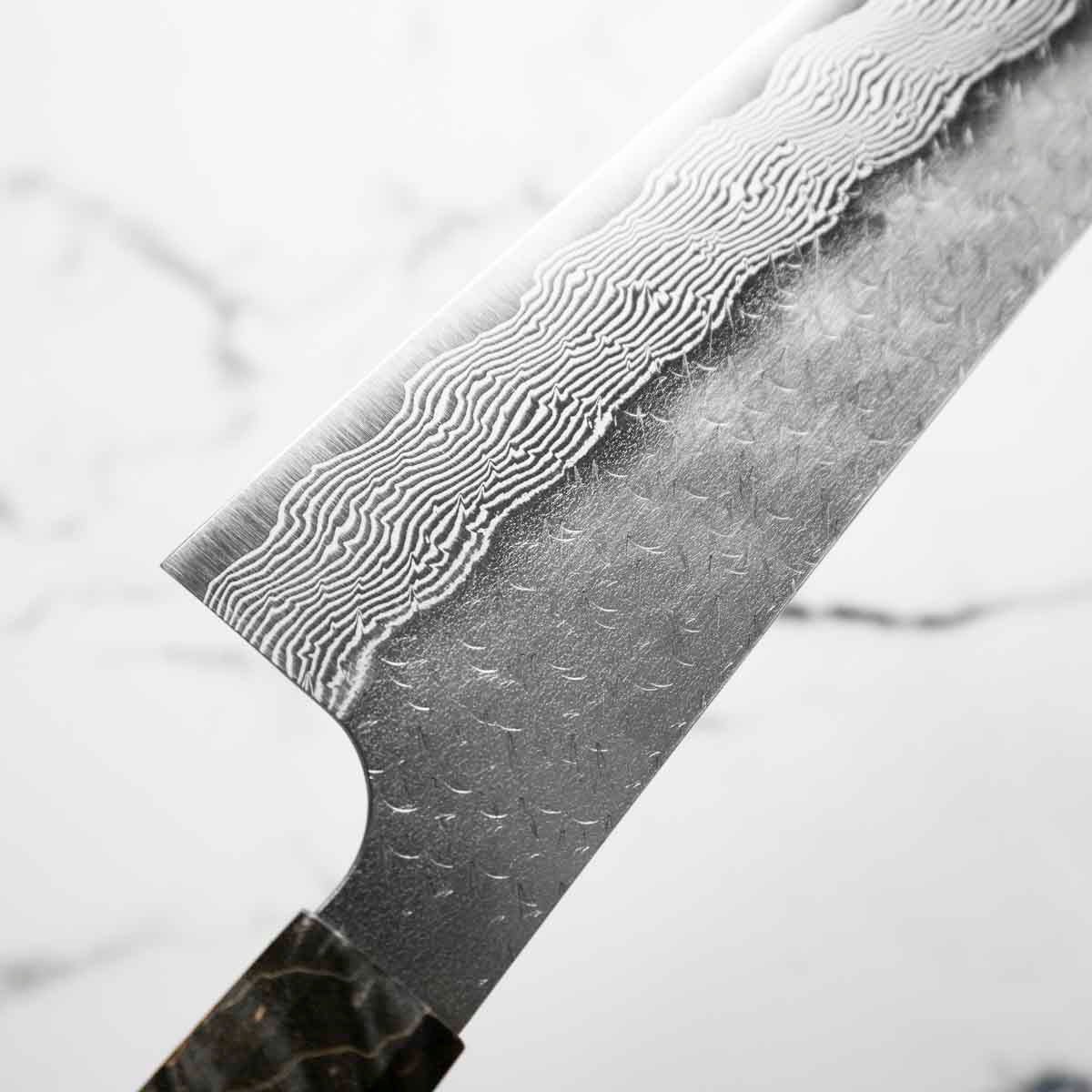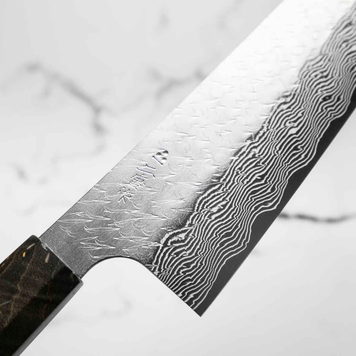 Nigara Hamono are truly some of the most experienced knifemakers in Japan. Now on their 8th generation of blacksmiths, they are masters at stainless damascus forging and heat treatment. The Anmon Damascus we have available have a matte finish and are polished underneath, resulting in a brilliant visual contrast.