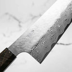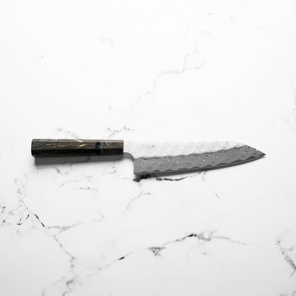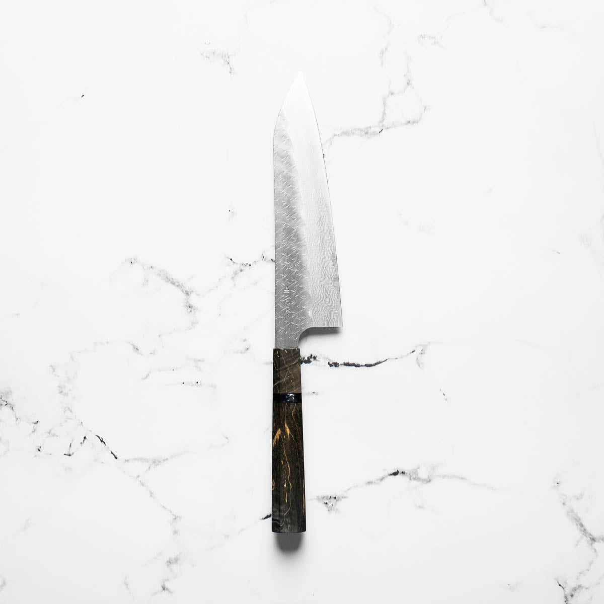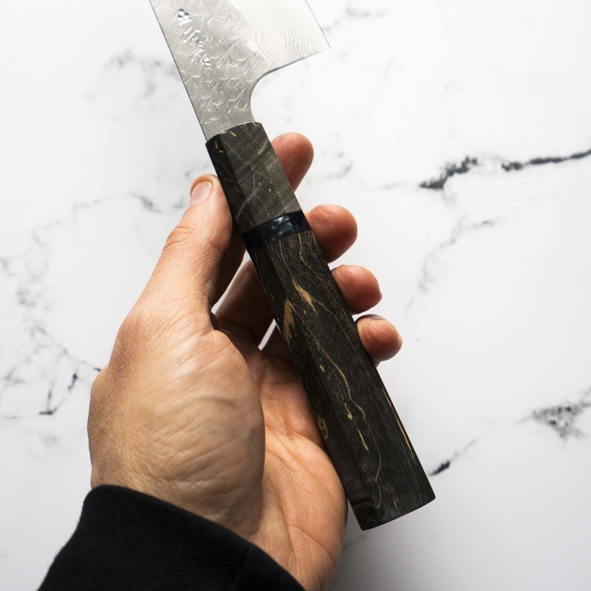 Nigara Hamono are truly some of the most experienced knifemakers in Japan. Now on their 8th generation of blacksmiths, they are masters at stainless damascus forging and heat treatment. The Anmon Damascus we have available have a matte finish and are polished underneath, resulting in a brilliant visual contrast.