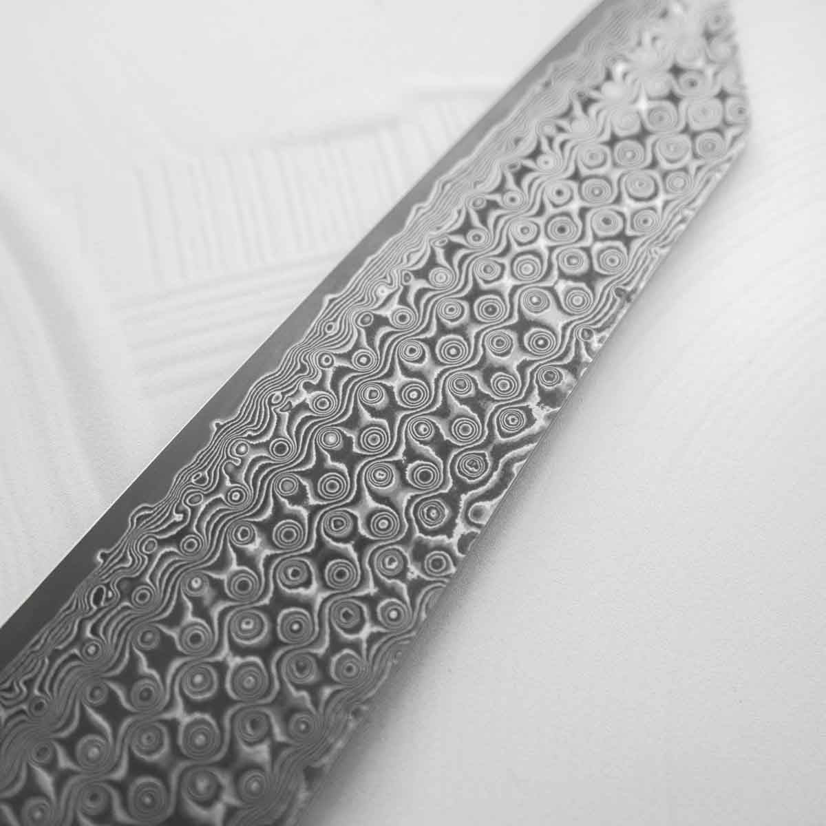Nigara Hamono are truly some of the most experienced knifemakers in Japan. Now on their 8th generation of blacksmiths, they are masters at stainless damascus forging and heat treatment. The Anmon Damascus we have available have a matte finish and are polished underneath, resulting in a brilliant visual contrast.
