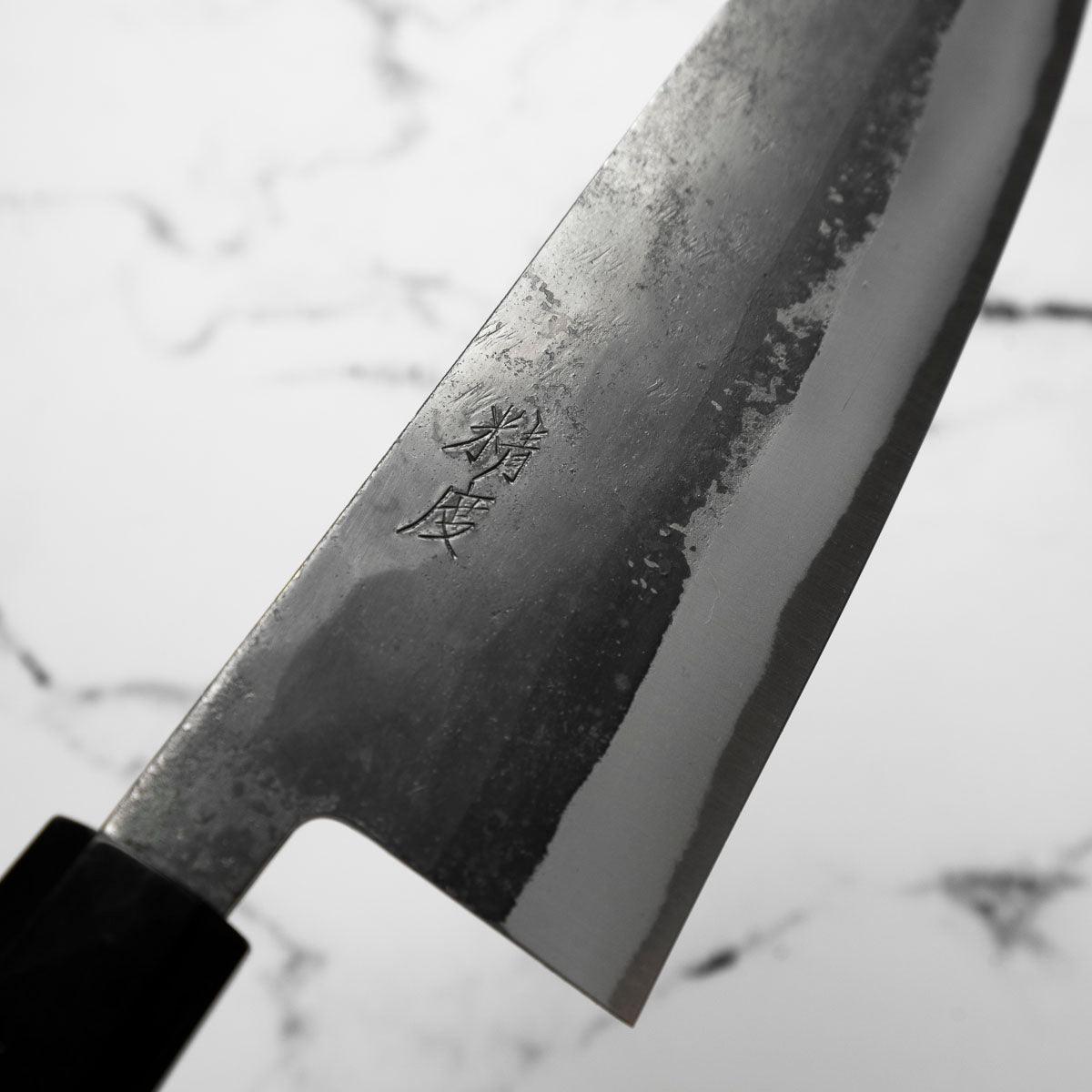 Japanese White Steel #2, a traditional high-carbon steel, is cherished for its purity and fine grain structure, enabling razor-sharp edges, at the cost of being reactive. It is one of the easiest steels to sharpen, but cannot be left wet for even short periods otherwise rust spots can occur. If you’re fastidious in your knife maintenance, this knife steel can be extremely rewarding to use.