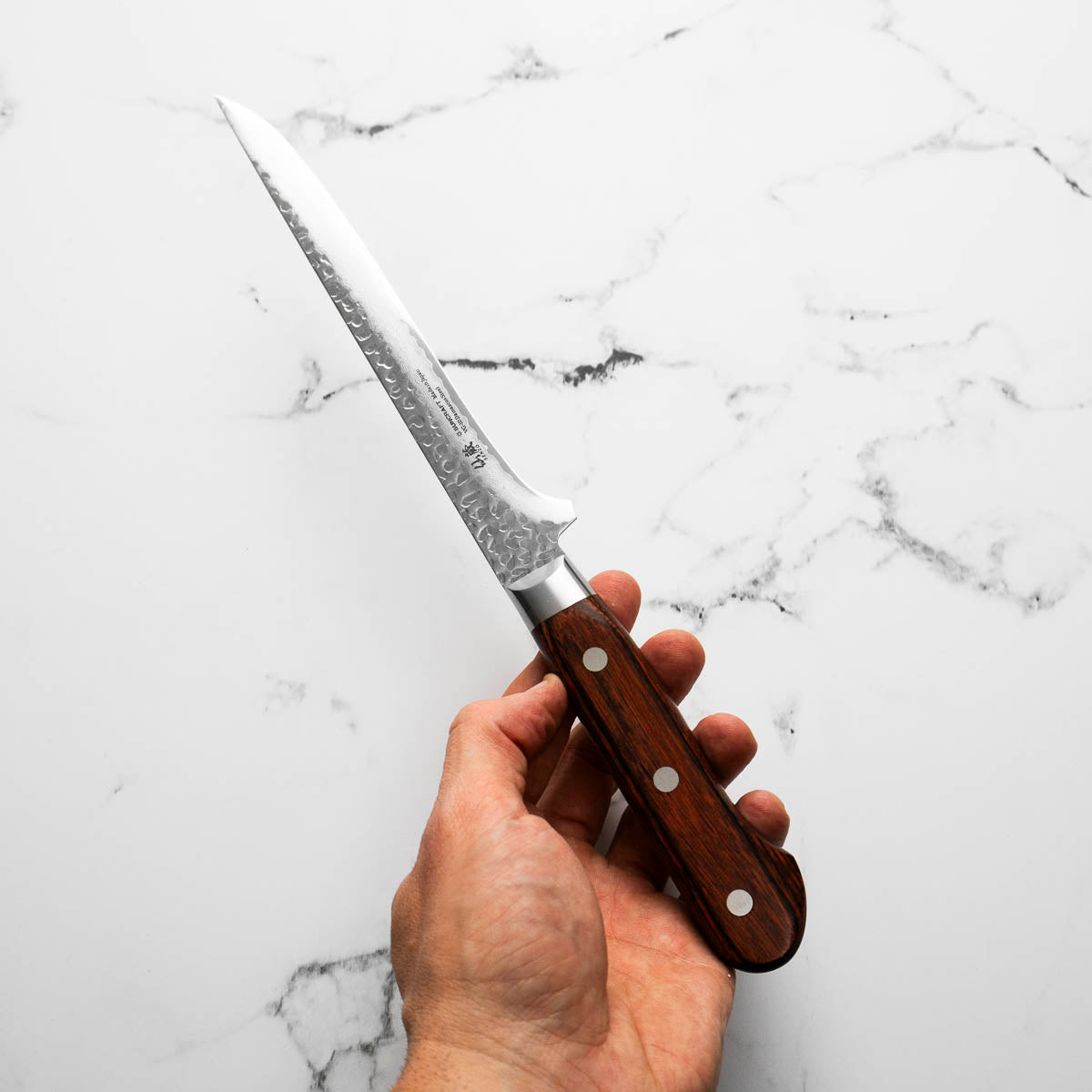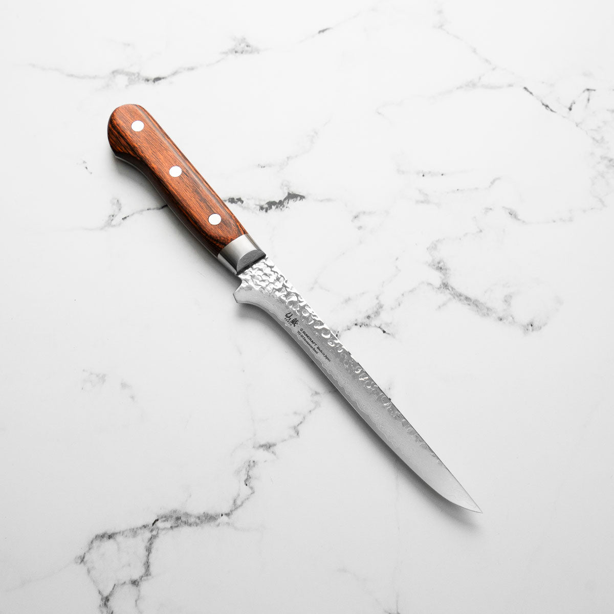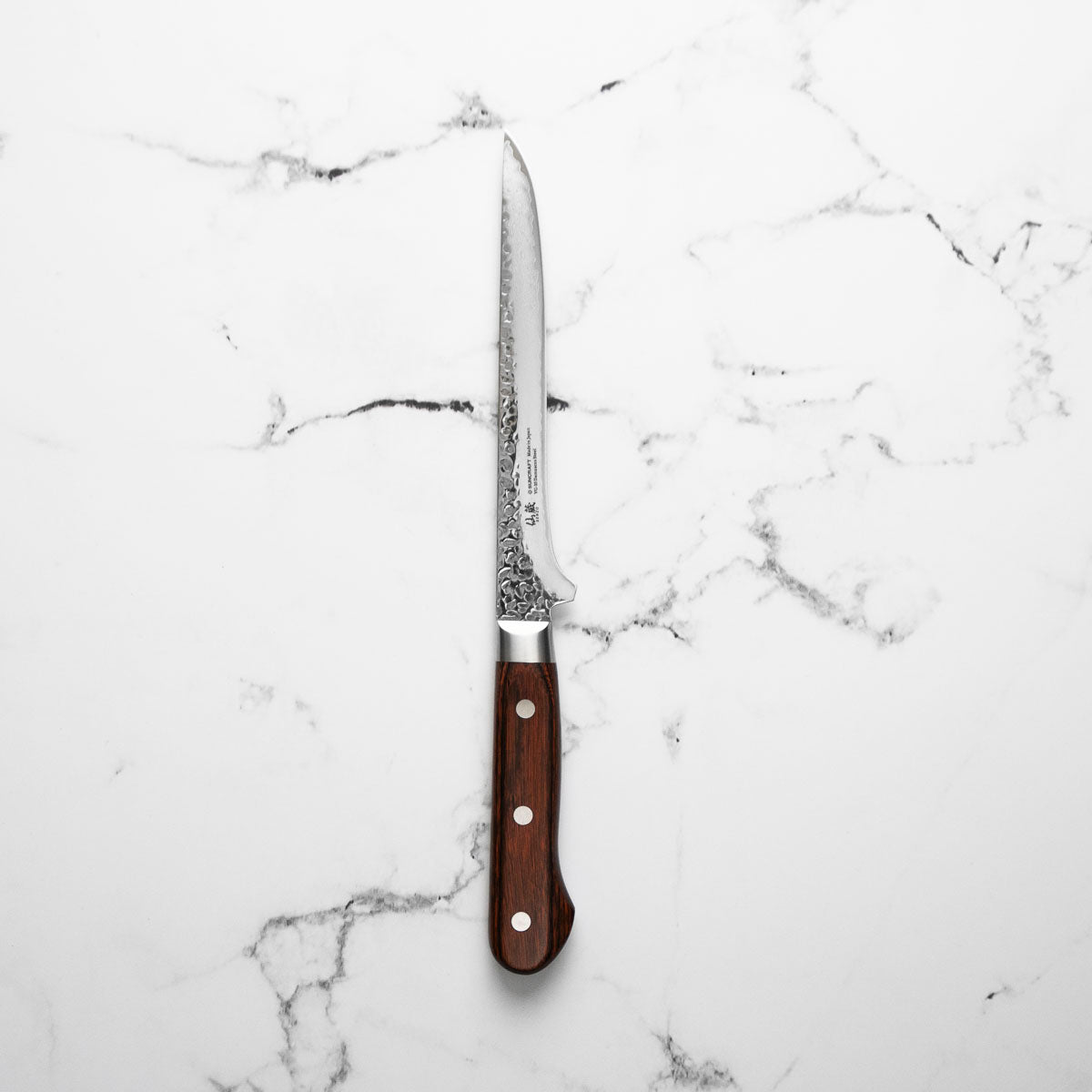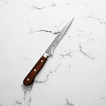 The boning knife, a specialized kitchen tool, is designed for separating meat from bones and trimming fat. With its shorter, flexible blade, typically ranging from 130mm to 160mm, it excels in maneuvering around joints and contours, allowing for precision in intricate cutting tasks. Its design ensures optimal control and accuracy, making it perfect for butchering and filleting various proteins, including poultry and fish.