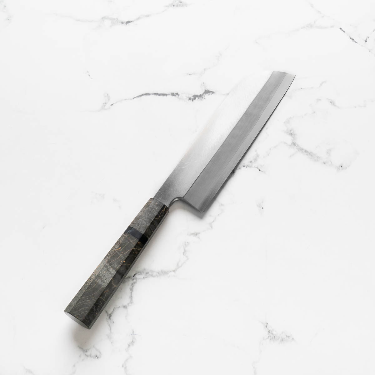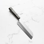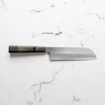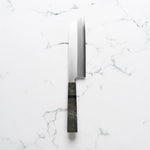 The Usuba knife, a traditional Japanese vegetable knife, is designed for precision vegetable work. With its tall, straight-edged blade, typically ranging from 165mm to 240mm, it excels in making thin, even cuts and decorative garnishes. The flat edge ensures full contact with the cutting board, ideal for push-cutting and peeling vegetables. Its single-bevel grind allows for extreme sharpness and control, making it a preferred choice among professional Japanese chefs for intricate vegetable preparation.