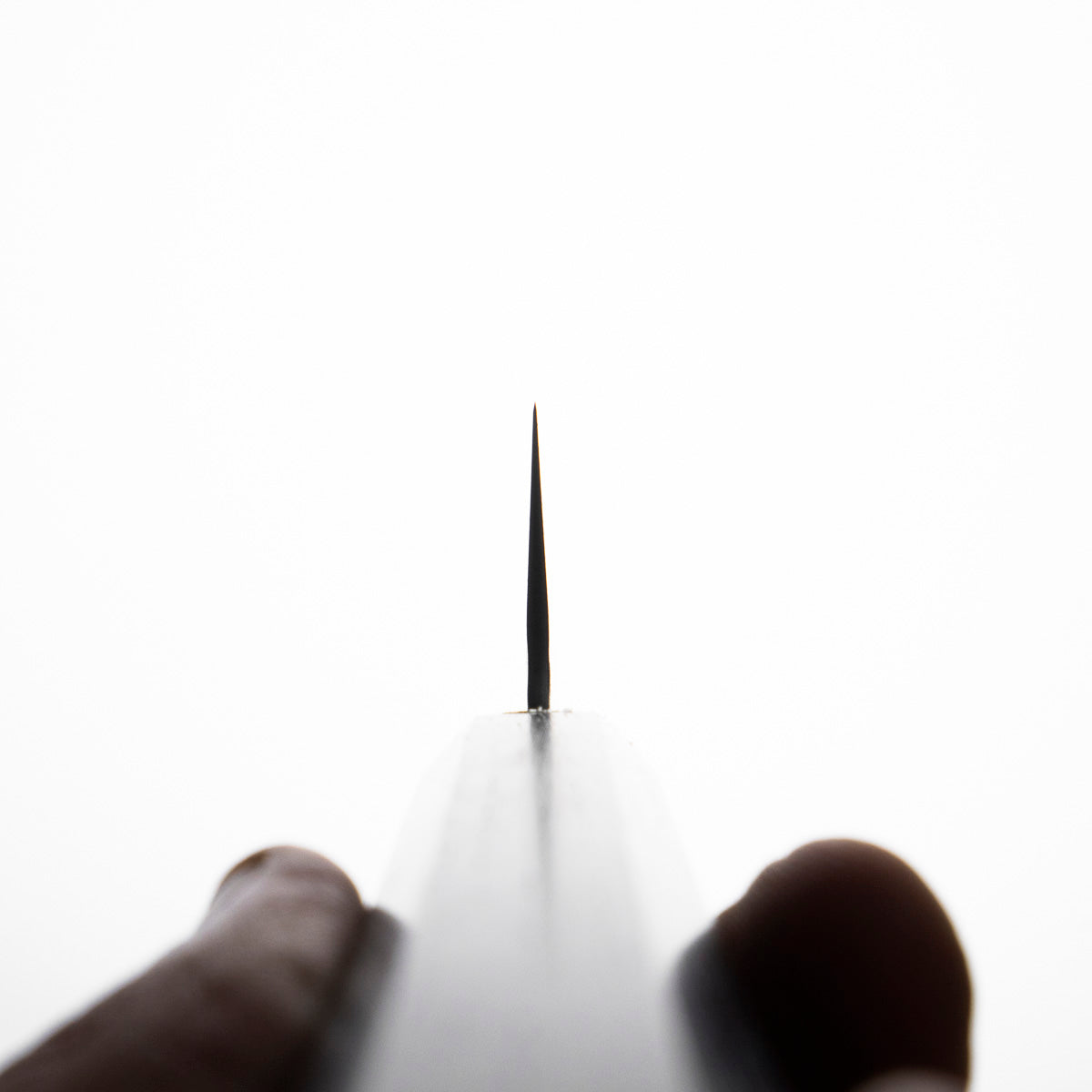 Japanese White Steel #2, a traditional high-carbon steel, is cherished for its purity and fine grain structure, enabling razor-sharp edges, at the cost of being reactive. It is one of the easiest steels to sharpen, but cannot be left wet for even short periods otherwise rust spots can occur. If you’re fastidious in your knife maintenance, this knife steel can be extremely rewarding to use.