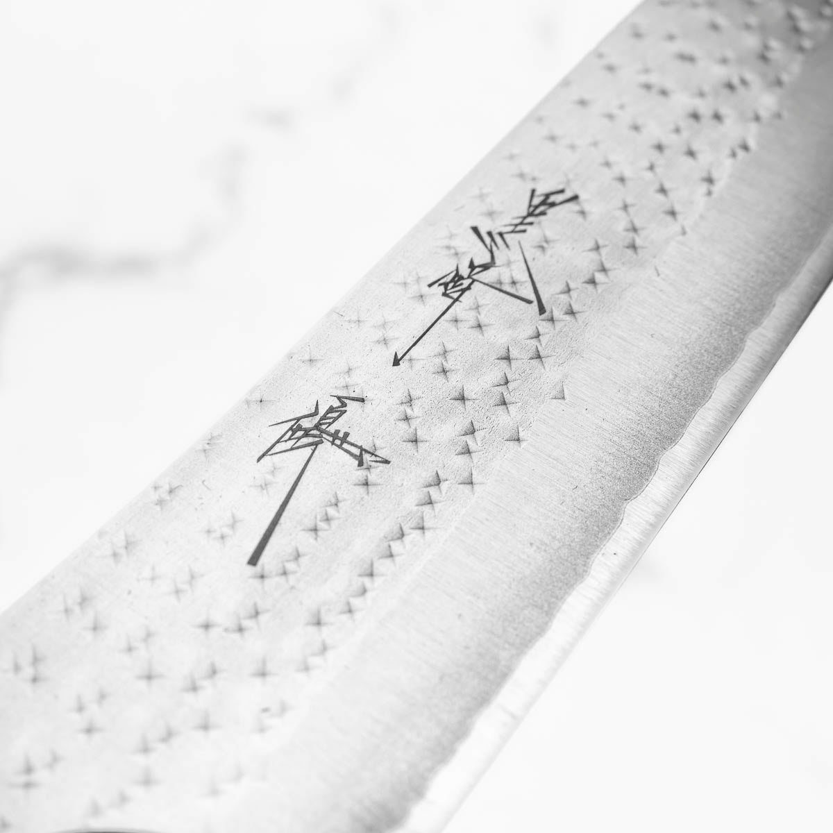 His knives are instantly recognizable for their striking Tsuchime and Suminagashi finishes, thin grinds, and use of high-performance steels such as SG2, HAP40, and stainless-clad Blue Super. Kurosaki’s Fujin series, with its dramatic wind-patterned hammer finish, helped cement his reputation as a blacksmith who blends artistry and technical brilliance in equal measure.