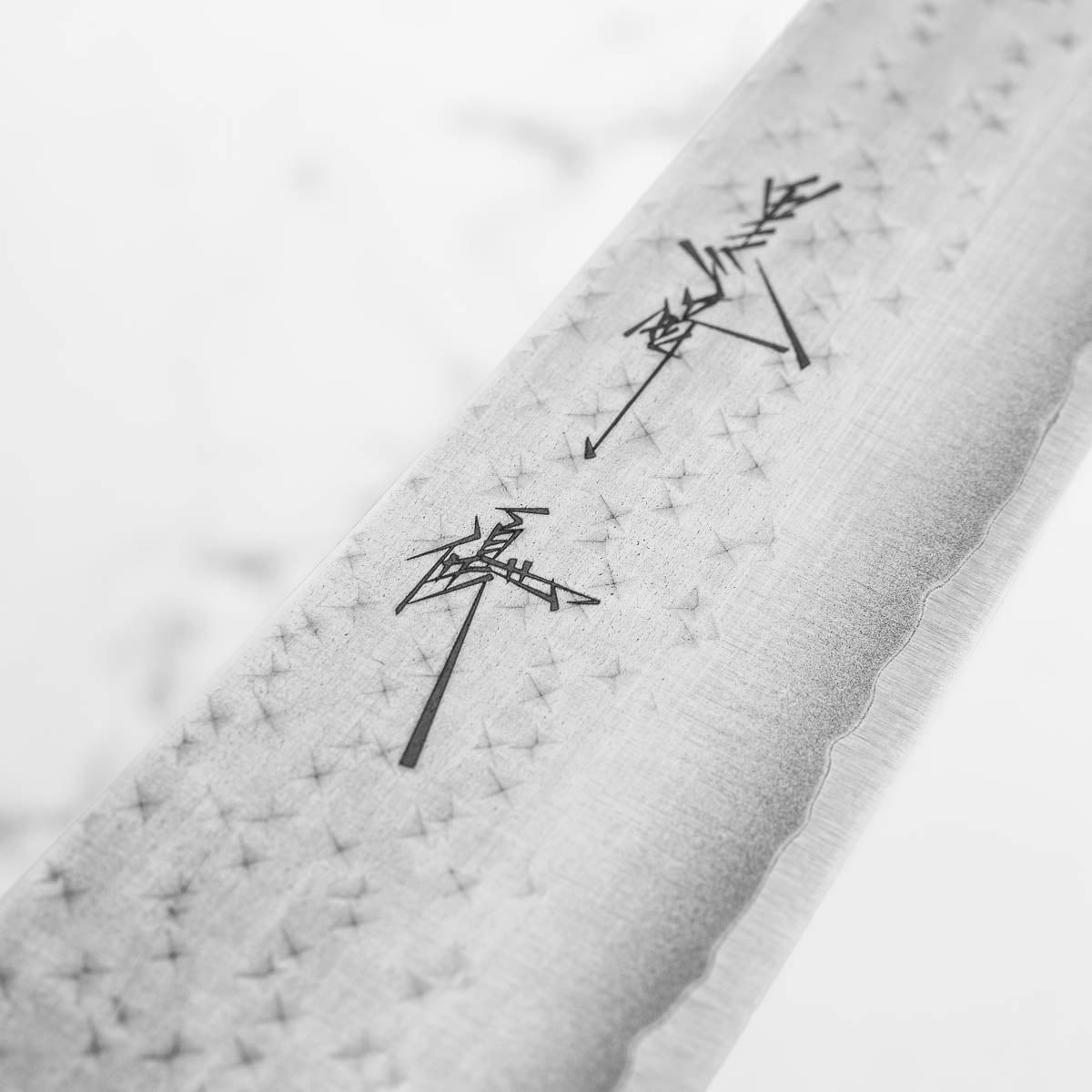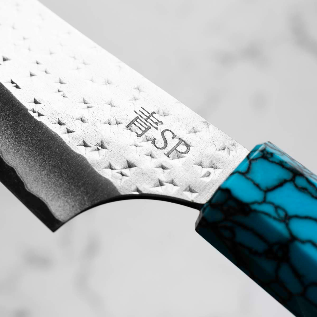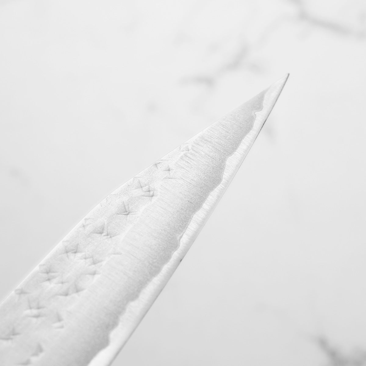 His knives are instantly recognizable for their striking Tsuchime and Suminagashi finishes, thin grinds, and use of high-performance steels such as SG2, HAP40, and stainless-clad Blue Super. Kurosaki’s Fujin series, with its dramatic wind-patterned hammer finish, helped cement his reputation as a blacksmith who blends artistry and technical brilliance in equal measure.