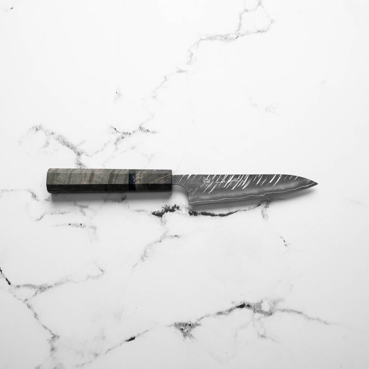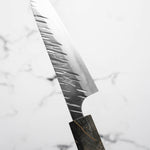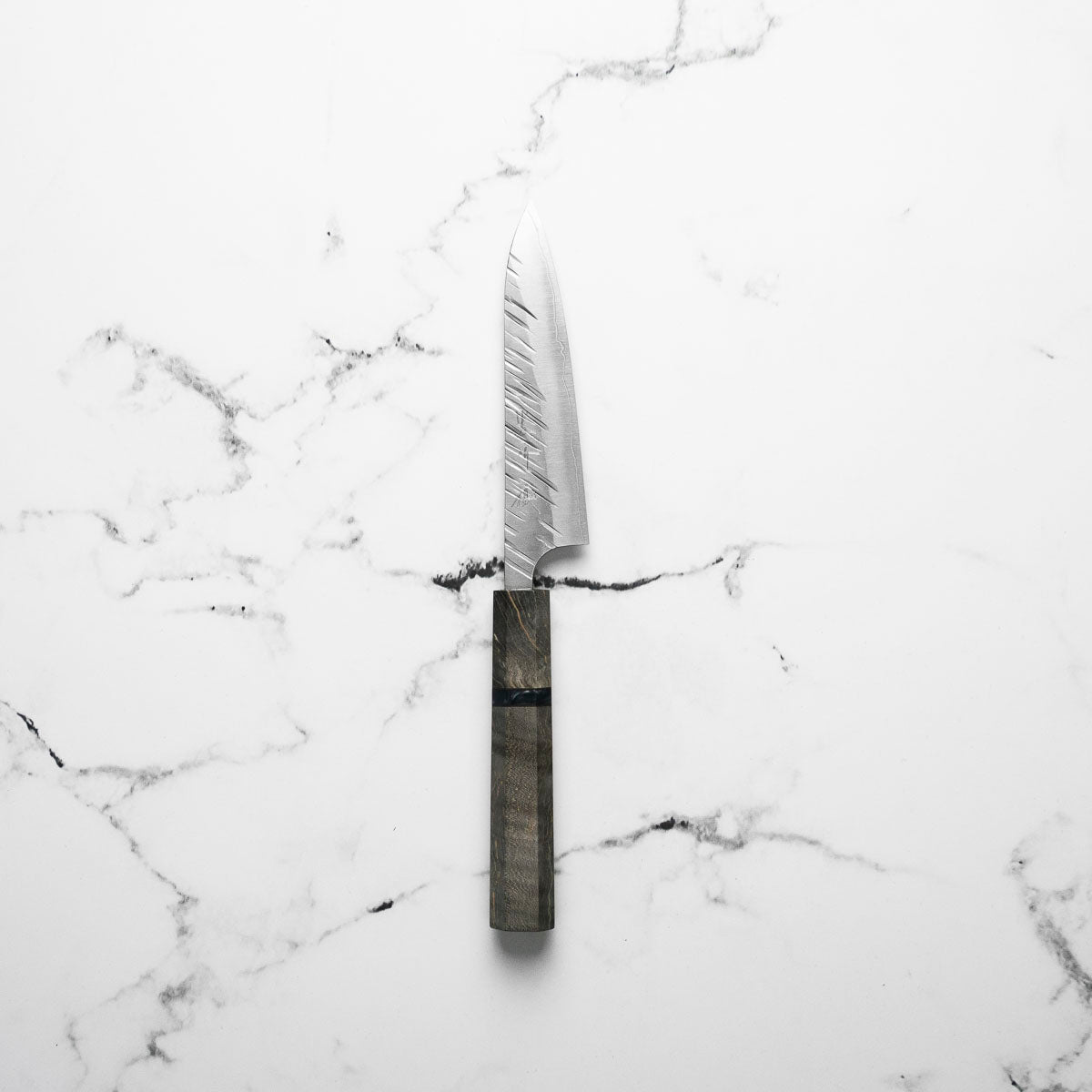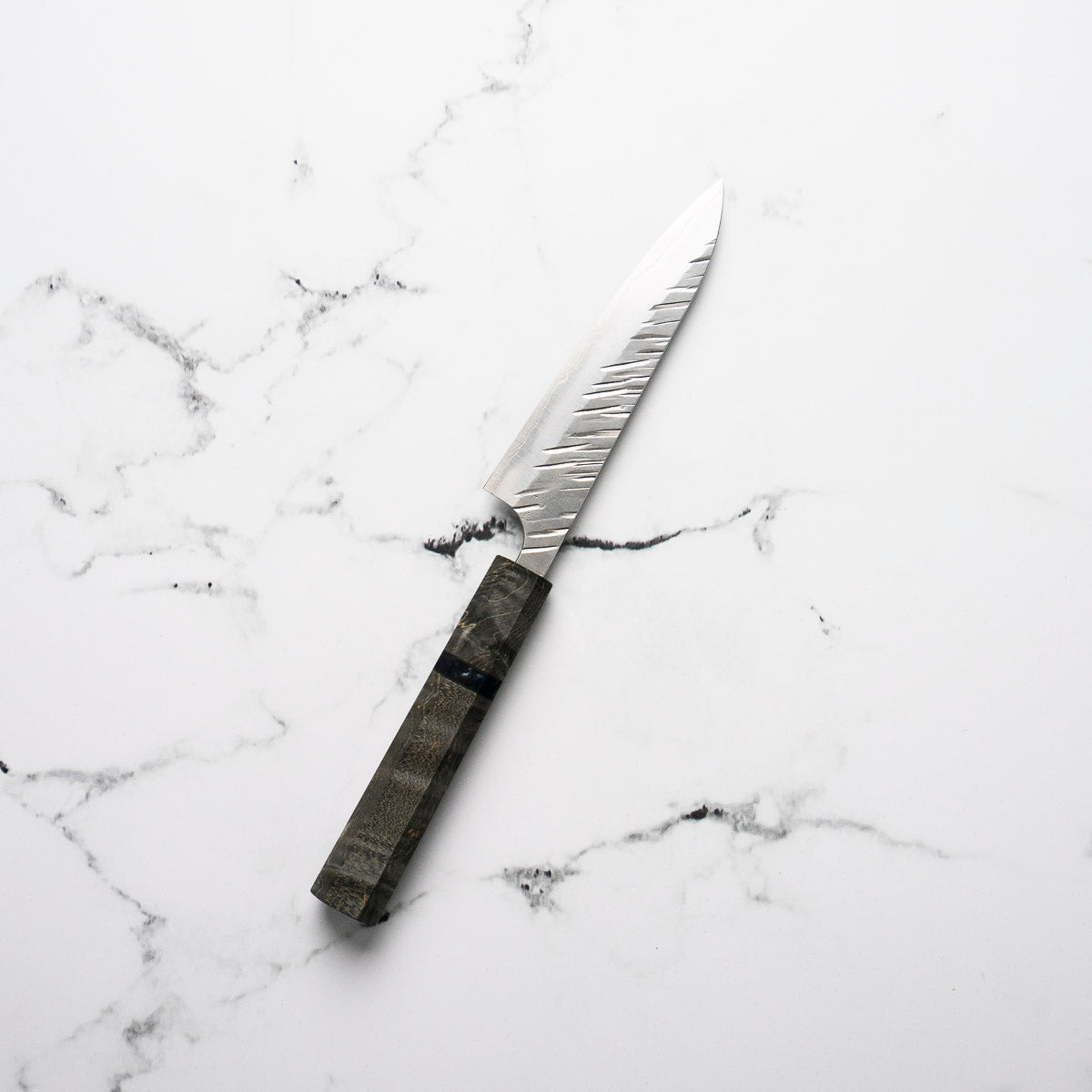 His knives are instantly recognizable for their striking Tsuchime and Suminagashi finishes, thin grinds, and use of high-performance steels such as SG2, HAP40, and stainless-clad Blue Super. Kurosaki’s Fujin series, with its dramatic wind-patterned hammer finish, helped cement his reputation as a blacksmith who blends artistry and technical brilliance in equal measure.