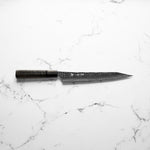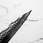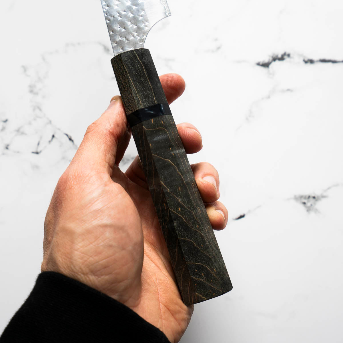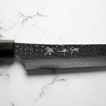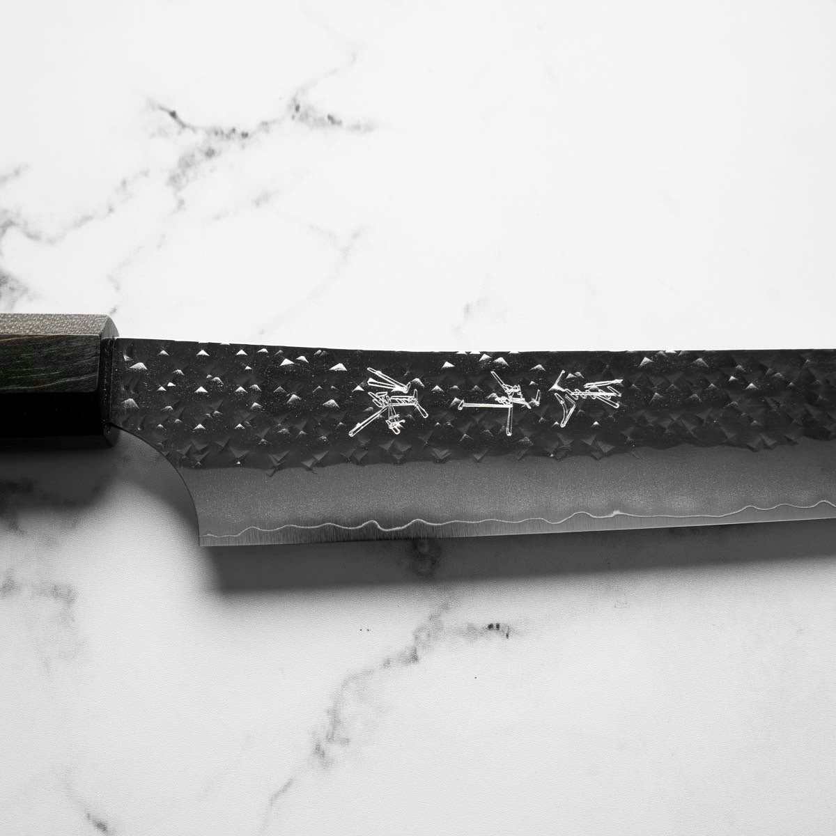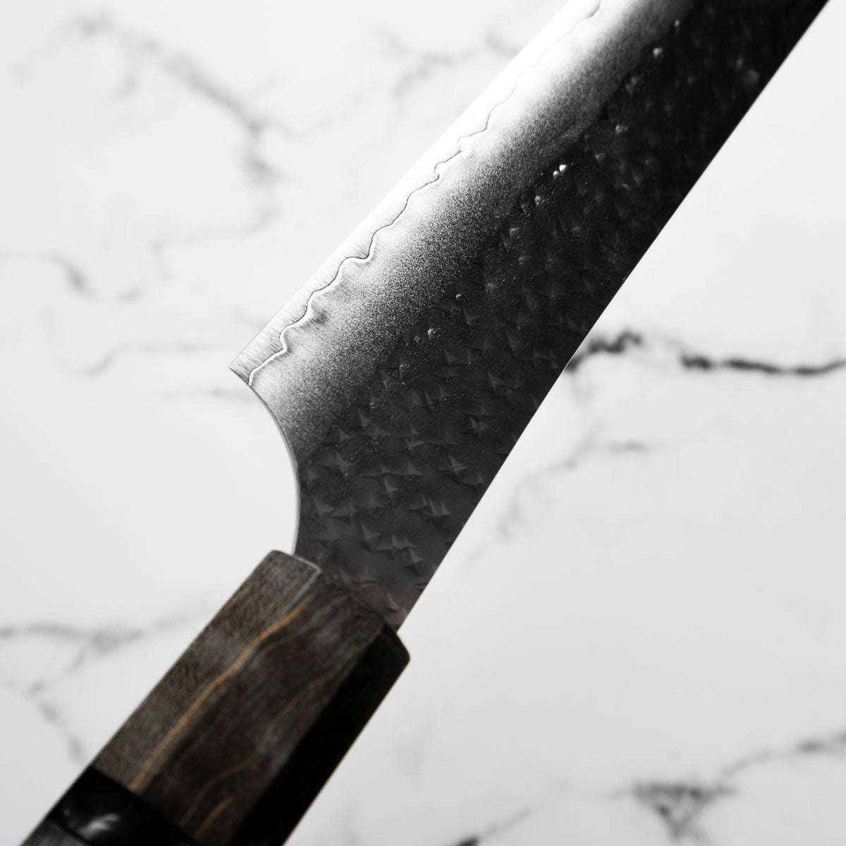 His knives are instantly recognizable for their striking Tsuchime and Suminagashi finishes, thin grinds, and use of high-performance steels such as SG2, HAP40, and stainless-clad Blue Super. Kurosaki’s Fujin series, with its dramatic wind-patterned hammer finish, helped cement his reputation as a blacksmith who blends artistry and technical brilliance in equal measure.