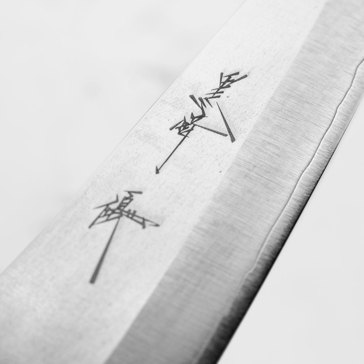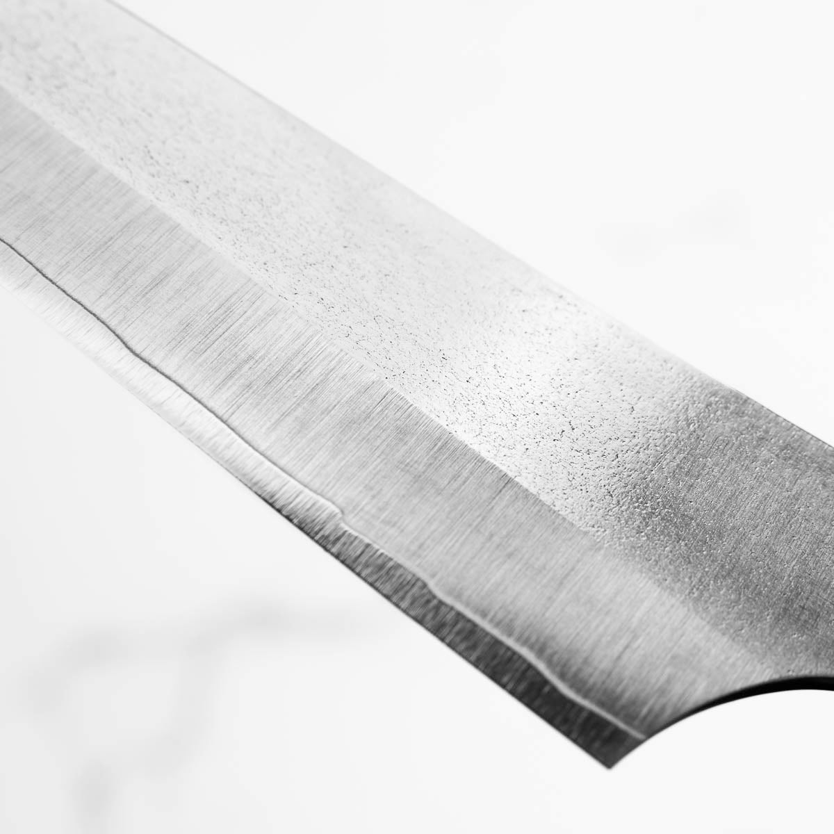 His knives are instantly recognizable for their striking Tsuchime and Suminagashi finishes, thin grinds, and use of high-performance steels such as SG2, HAP40, and stainless-clad Blue Super. Kurosaki’s Fujin series, with its dramatic wind-patterned hammer finish, helped cement his reputation as a blacksmith who blends artistry and technical brilliance in equal measure.