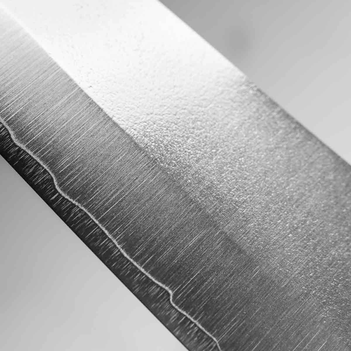 His knives are instantly recognizable for their striking Tsuchime and Suminagashi finishes, thin grinds, and use of high-performance steels such as SG2, HAP40, and stainless-clad Blue Super. Kurosaki’s Fujin series, with its dramatic wind-patterned hammer finish, helped cement his reputation as a blacksmith who blends artistry and technical brilliance in equal measure.