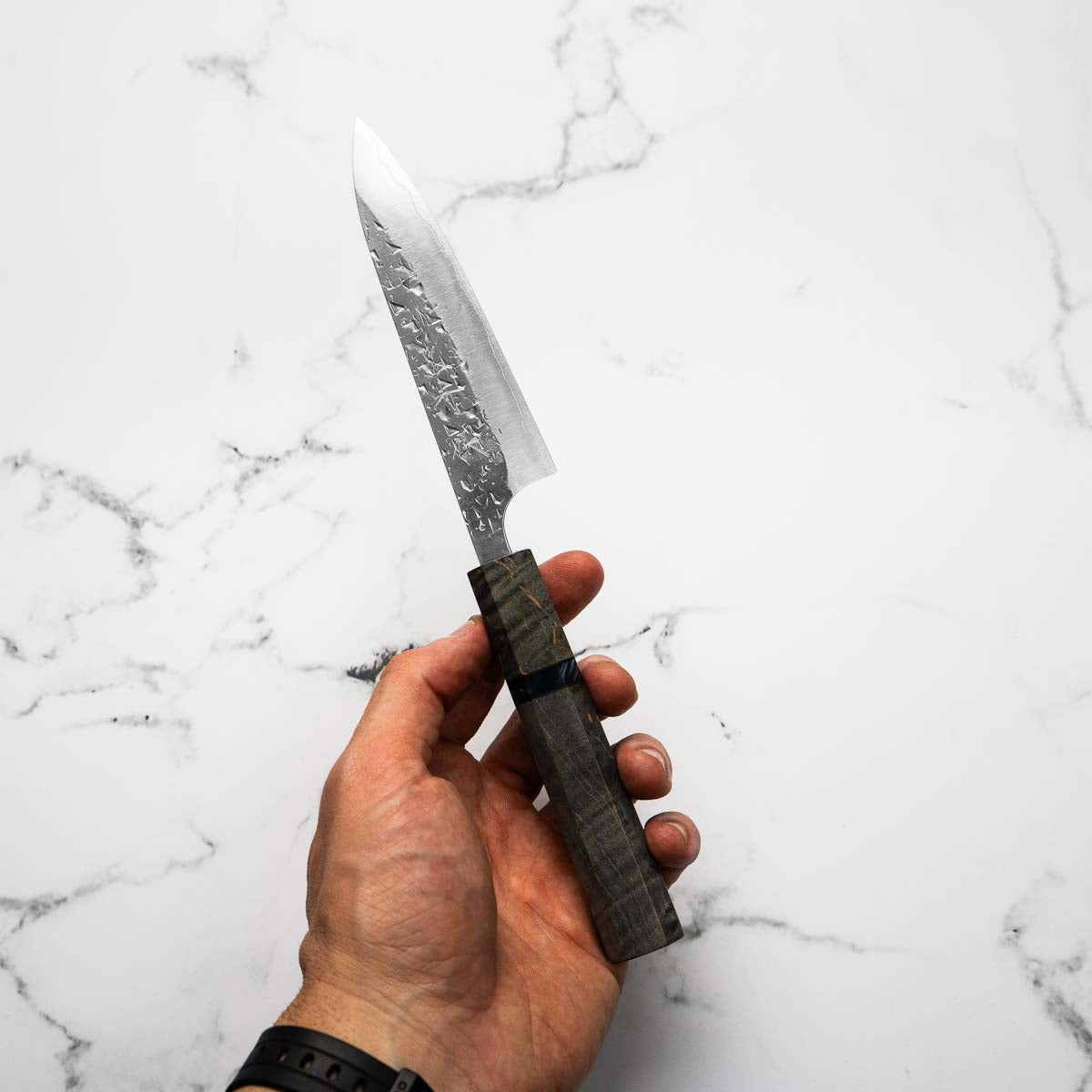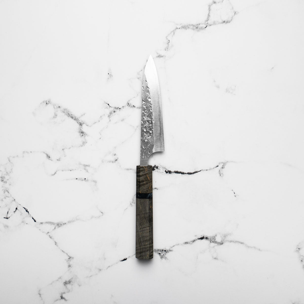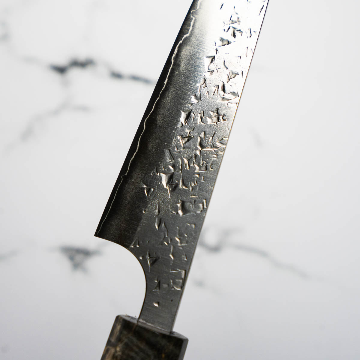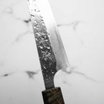 His knives are instantly recognizable for their striking Tsuchime and Suminagashi finishes, thin grinds, and use of high-performance steels such as SG2, HAP40, and stainless-clad Blue Super. Kurosaki’s Fujin series, with its dramatic wind-patterned hammer finish, helped cement his reputation as a blacksmith who blends artistry and technical brilliance in equal measure.
