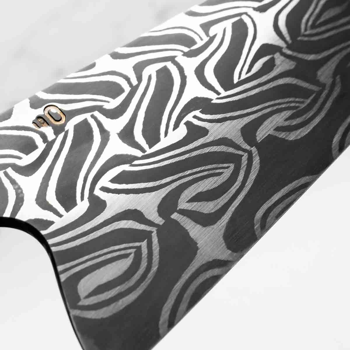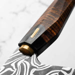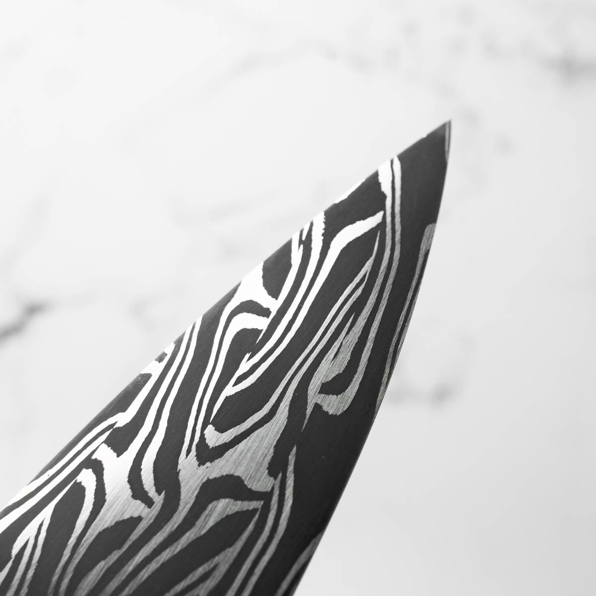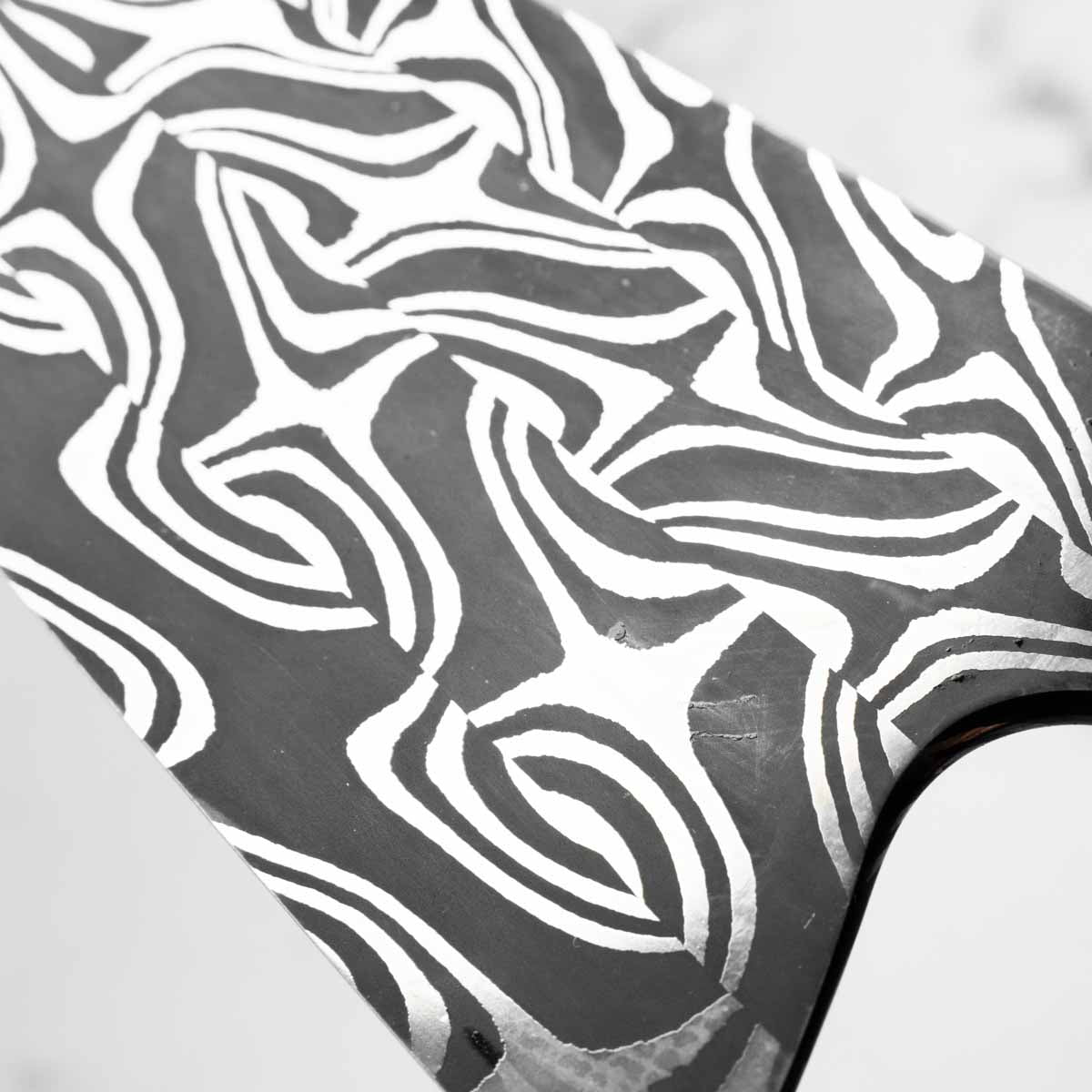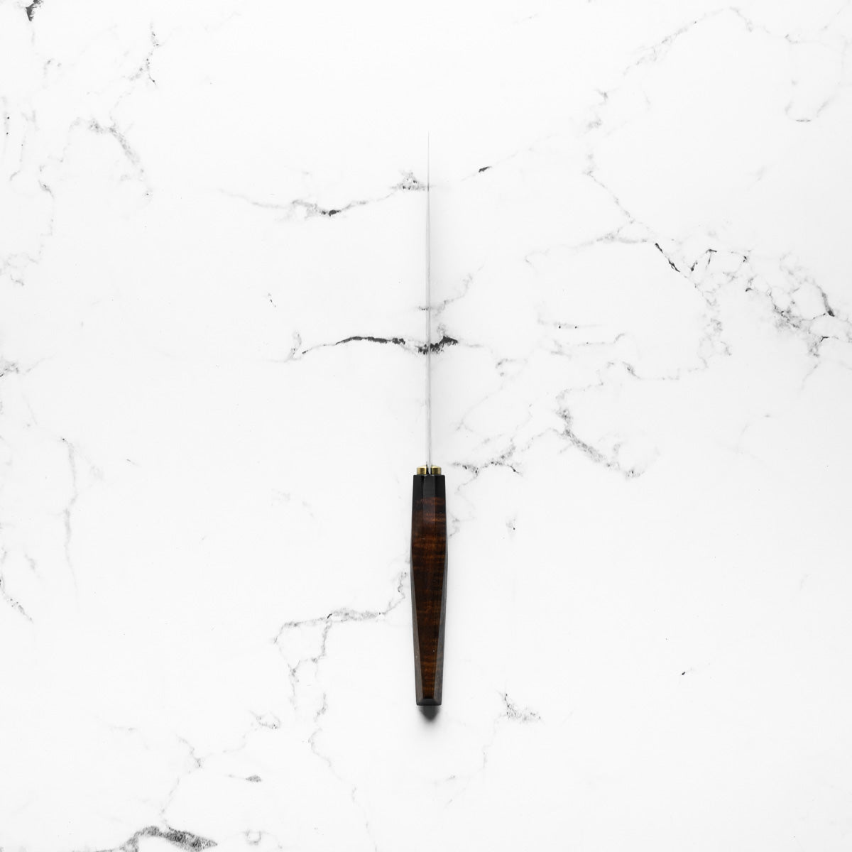 This knife is made from a high-carbon steel and as such, will require a little more care than a regular off-the-shelf knife. It must be dried shortly after use, as prolonged exposure to moisture can cause rust spots to appear. A very light coat of oil during storage also helps to prevent rust spots. A patina (colouration and seasoning of the steel) will occur with use.