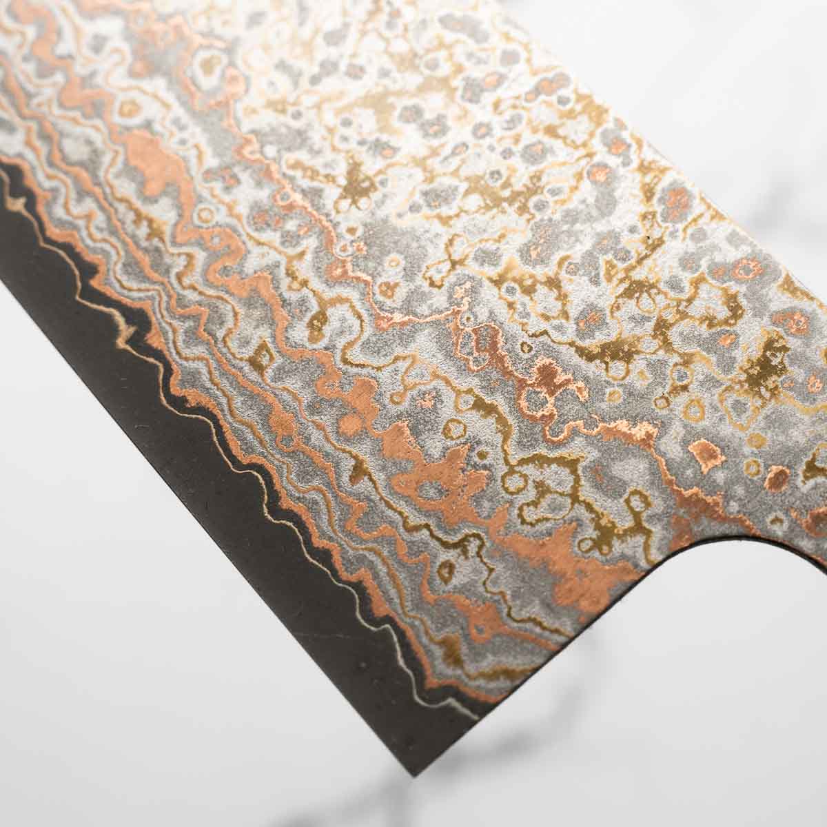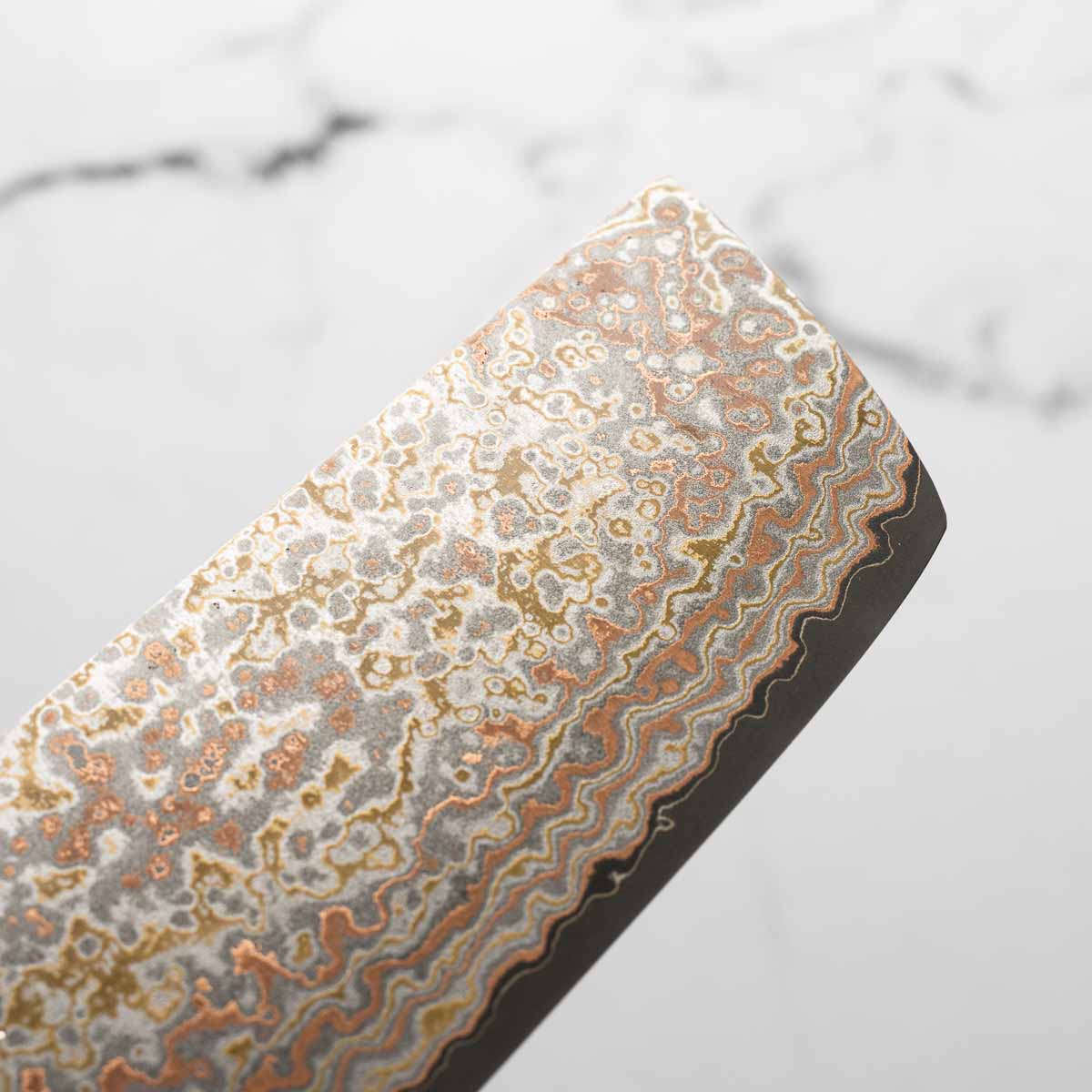 He works across a wide spectrum of steels, from classic Japanese carbon steels to advanced stainless alloys like R2 and VG10. His signature Damascus finishes — including Rainbow, Diamond, and Black Nickel — are unmistakable, and are often paired with an eclectic range of handle styles that reflect both innovation and deep respect for materials.