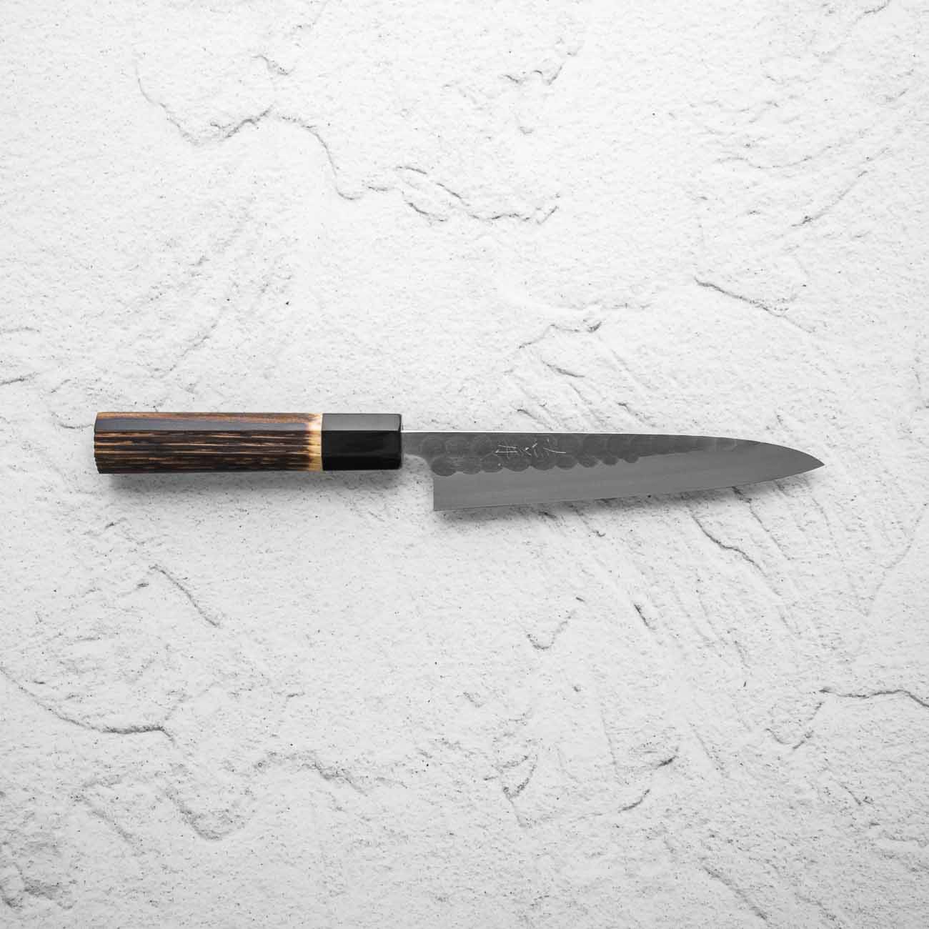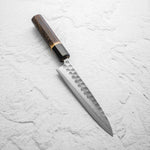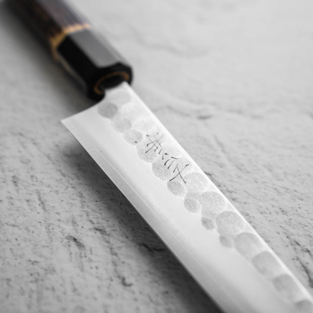 One of their most celebrated offerings is the SKD steel series — featuring a semi-stainless high-carbon core clad in stainless steel. The blades showcase a distinctive wide-bevel grind with a shallow hammer texture that sits stylistically between nashiji and kurouchi finishes. Paired with traditional burnt chestnut handles, each knife reflects Yoshikane’s dedication to consistency, craftsmanship, and timeless design.