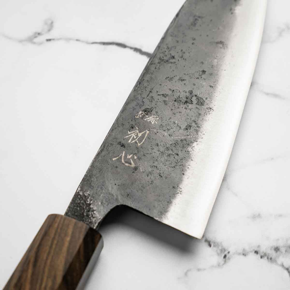 This knife is made from a high-carbon steel and as such, will require a little more care than a regular off-the-shelf knife. It must be dried shortly after use, as prolonged exposure to moisture can cause rust spots to appear. A very light coat of oil during storage also helps to prevent rust spots. A patina (colouration and seasoning of the steel) will occur with use.
