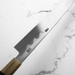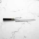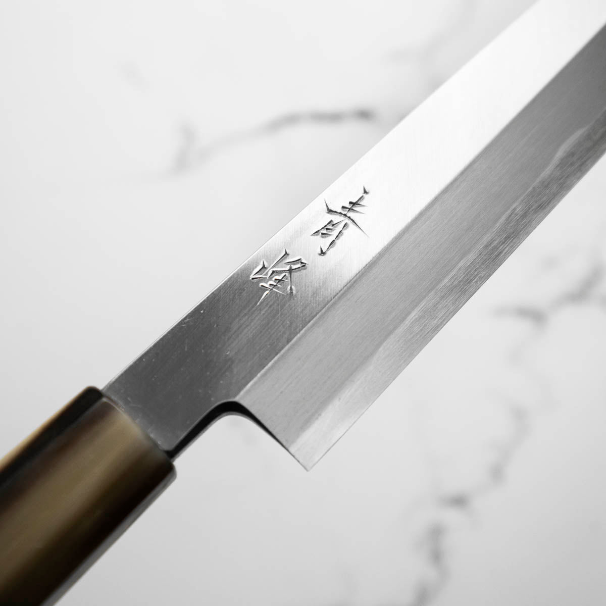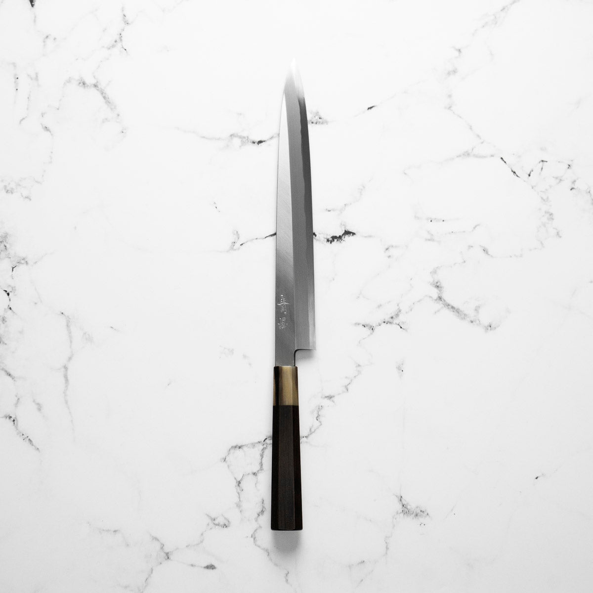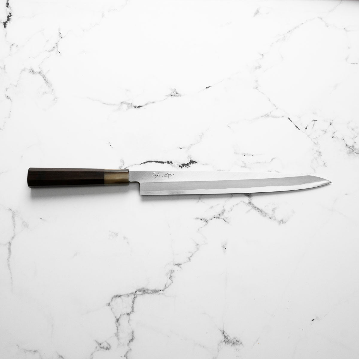 The Yanagiba knife, a staple in traditional Japanese cuisine, is a slender, long-bladed knife primarily used for slicing sashimi and sushi. Its graceful, single-beveled edge guarantees precise, thin cuts, preserving the texture and integrity of the fish. Revered for its sharpness and balance, the Yanagiba is essential for authentic Japanese food preparation.