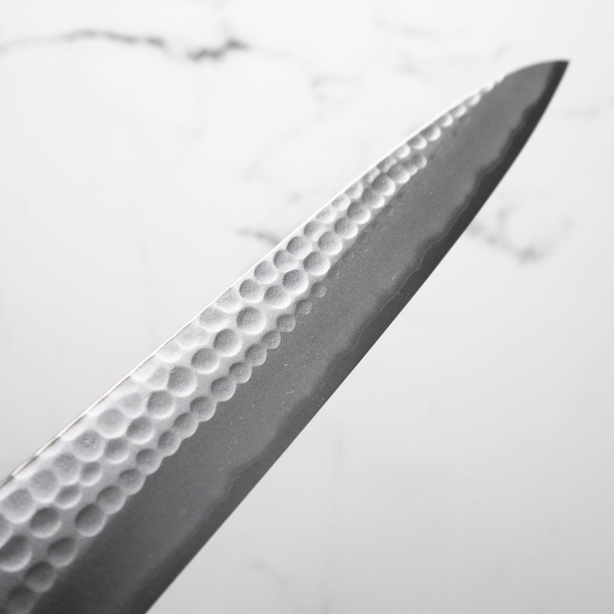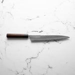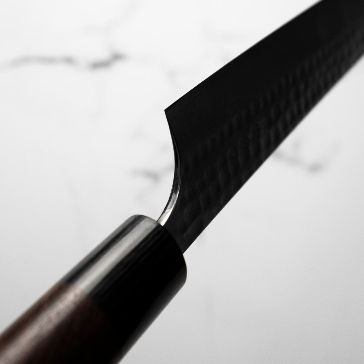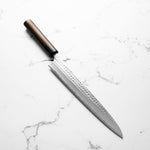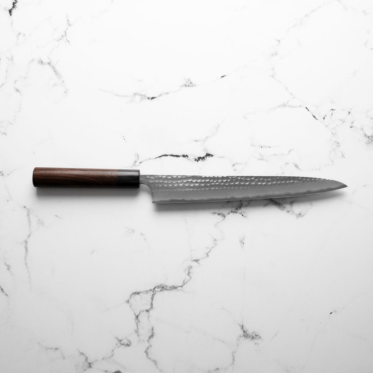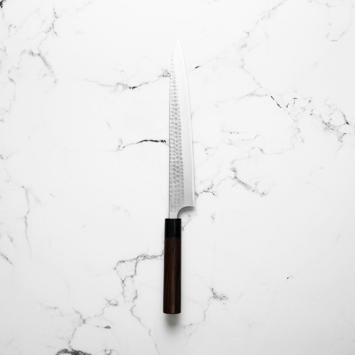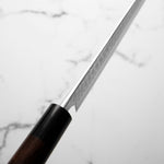 The Sujihiki knife, a traditional Japanese slicer, is designed for carving and fileting. With its long, narrow blade, typically ranging from 240mm to 330mm, it excels in creating clean, smooth cuts through meat and fish. Its length ensures long, uninterrupted strokes, making it perfect for precise slicing tasks.