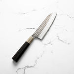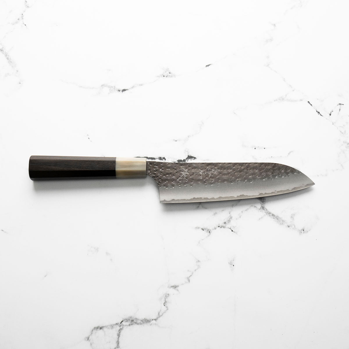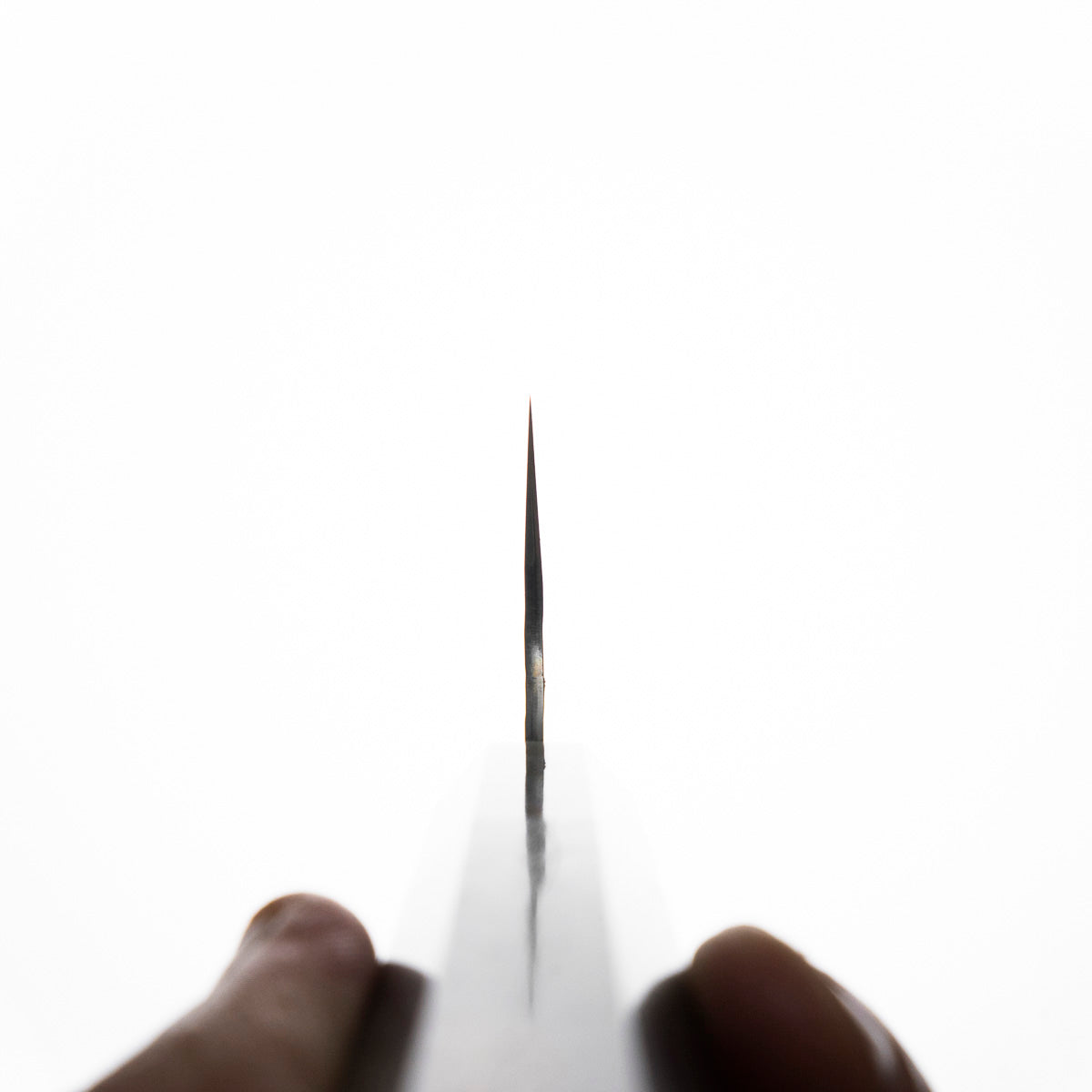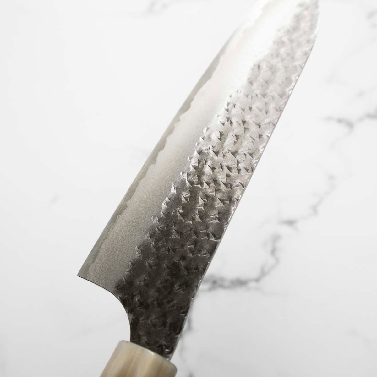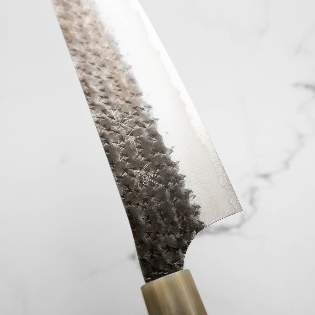 His knives are instantly recognizable for their striking Tsuchime and Suminagashi finishes, thin grinds, and use of high-performance steels such as SG2, HAP40, and stainless-clad Blue Super. Kurosaki’s Fujin series, with its dramatic wind-patterned hammer finish, helped cement his reputation as a blacksmith who blends artistry and technical brilliance in equal measure.