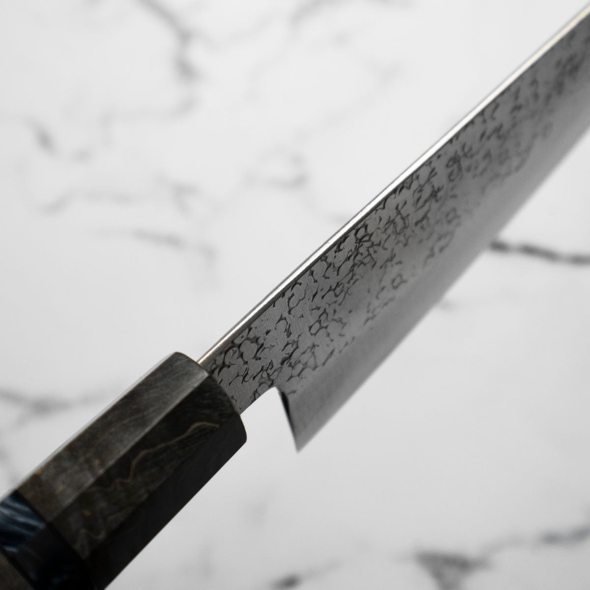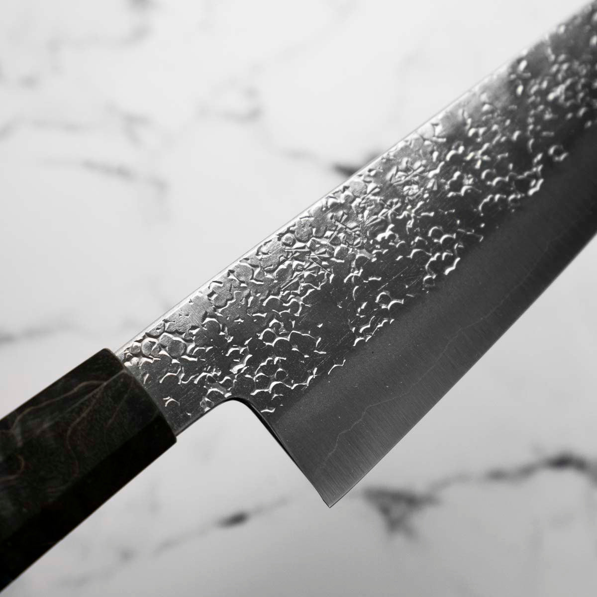 Japanese Ginsan steel, also known as Silver-3 or G3, is an underrated high-grade semi-stainless steel loved by many for being in the ‘goldilocks zone’ of knife steels. It holds a very respectable edge, but is effortless to sharpen. It is considered the semi-stainless version of White 2. It is the knife steel of choice for many home cooks and professional chefs alike.