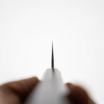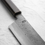 Japanese White Steel #2, a traditional high-carbon steel, is cherished for its purity and fine grain structure, enabling razor-sharp edges, at the cost of being reactive. It is one of the easiest steels to sharpen, but cannot be left wet for even short periods otherwise rust spots can occur. If you’re fastidious in your knife maintenance, this knife can steel can be extremely rewarding to use.