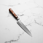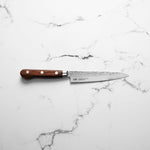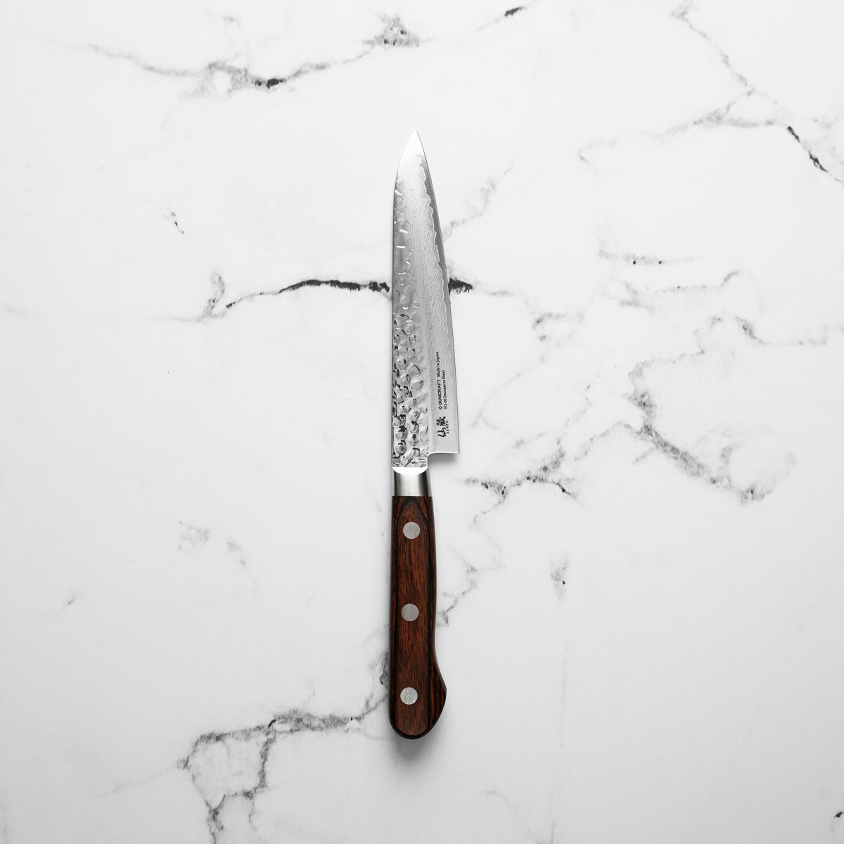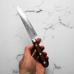 The Petty knife, a quintessential tool in Japanese cuisine, is a smaller utility knife used for precise, delicate tasks. Often considered a smaller sibling to the chef's knife, it excels in hand-held tasks like peeling, trimming, and intricate cutting. Its versatility makes it an essential for detailed culinary work.