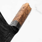This knife is made from a high-carbon steel and as such, will require a little more care than a regular off-the-shelf knife. It must be dried shortly after use, as prolonged exposure to moisture can cause rust spots to appear. A very light coat of oil during storage also helps to prevent rust spots. A patina (colouration and seasoning of the steel) will occur with use.