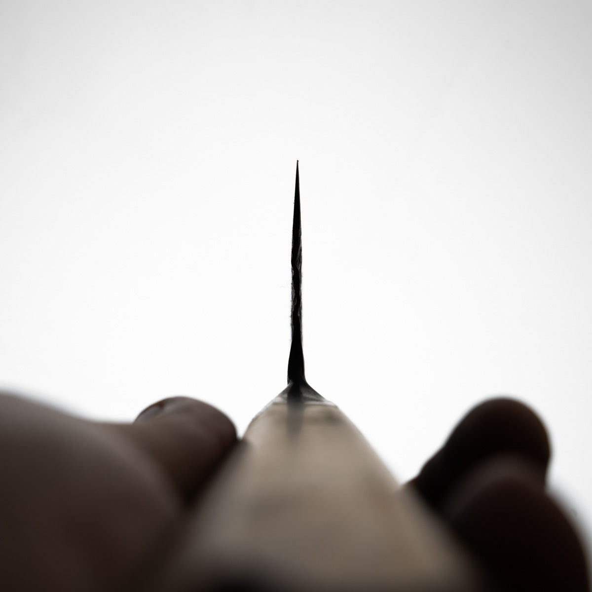 This knife is made from a high-carbon steel and as such, will require a little more care than a regular off-the-shelf knife. It must be dried shortly after use, as prolonged exposure to moisture can cause rust spots to appear. A very light coat of oil during storage also helps to prevent rust spots. A patina (colouration and seasoning of the steel) will occur with use.
